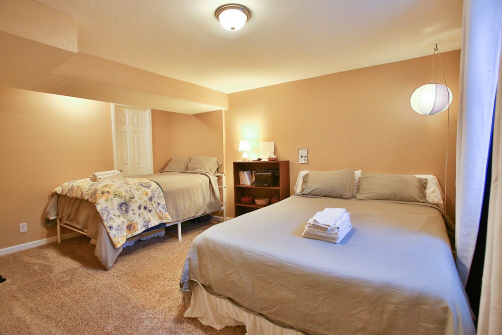 Labai arti DIA IR apie 25 minutes iki miesto centro. Du miegamieji, 2 vonios kambariai 4 akrų plote. 1000 kvadratinių pėdų. Ramybė su nuostabiais kalnų vaizdais. Tai apima prieigą prie prijungtos virtuvės, valgomojo ir stalo/darbo vietos. Namai toli nuo namų! Gali apsistoti 6 svečiai vienoje dvigulėje, 1 dvigulėje ir 1 ištraukiamoje dvigulėje lovoje. Už papildomą mokestį prieš apsilankymą galima užsisakyti neprivalomą dvigulę lovą. Nuostabūs Uolų vaizdai! Namų rūsio aukštas, o mes gyvename viršuje su dviem šunimis.