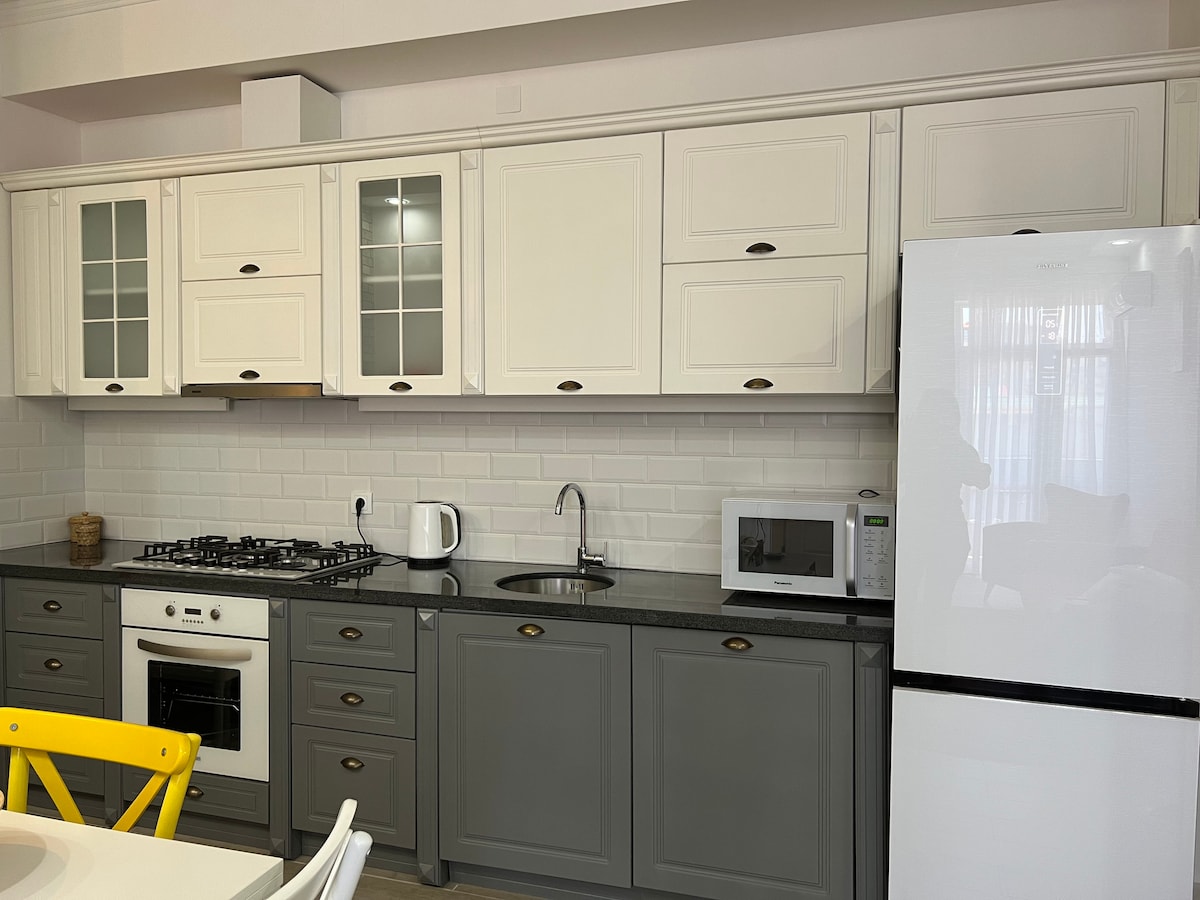Naujas, erdvus, jaukus, geriausia vieta Batumyje, už 100 metrų nuo paplūdimio, miegamieji su vaizdu į kalnus, svetainė su vaizdu į jūrą. Taip pat kiekvieną vakarą iš svetainės galima pamatyti lazerinius muzikinius fontanus. Netoli buto yra „McDonald's“, 300 metrų iki delfinariumo, 300 metrų iki centrinio Batumio parko, 50 metrų iki prekybos centro (veikia 24 valandas). Aplink daug įvairių restoranų.