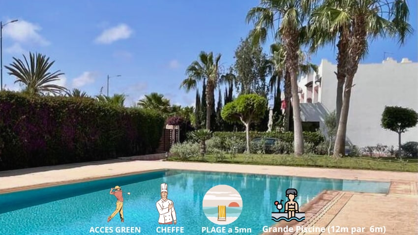 Magnifique Villa avec piscine chauffée dans une toute nouvelle Résidence luxueuse et sécurisée 24h/24. Parfaite pour 4 Adultes plus 2 enfants payants max, golfeurs, vacanciers, familles et exploitée avec un services hôteliers inclus un PDJ Continental, ménage tous les 3 jours, Conciergerie 7/7; cuisine privatisée possible selon disponibilité. Elle est à proximité de 3minutes de 3Golfs et à 5minutes de la mer & du centre-ville d’Agadir