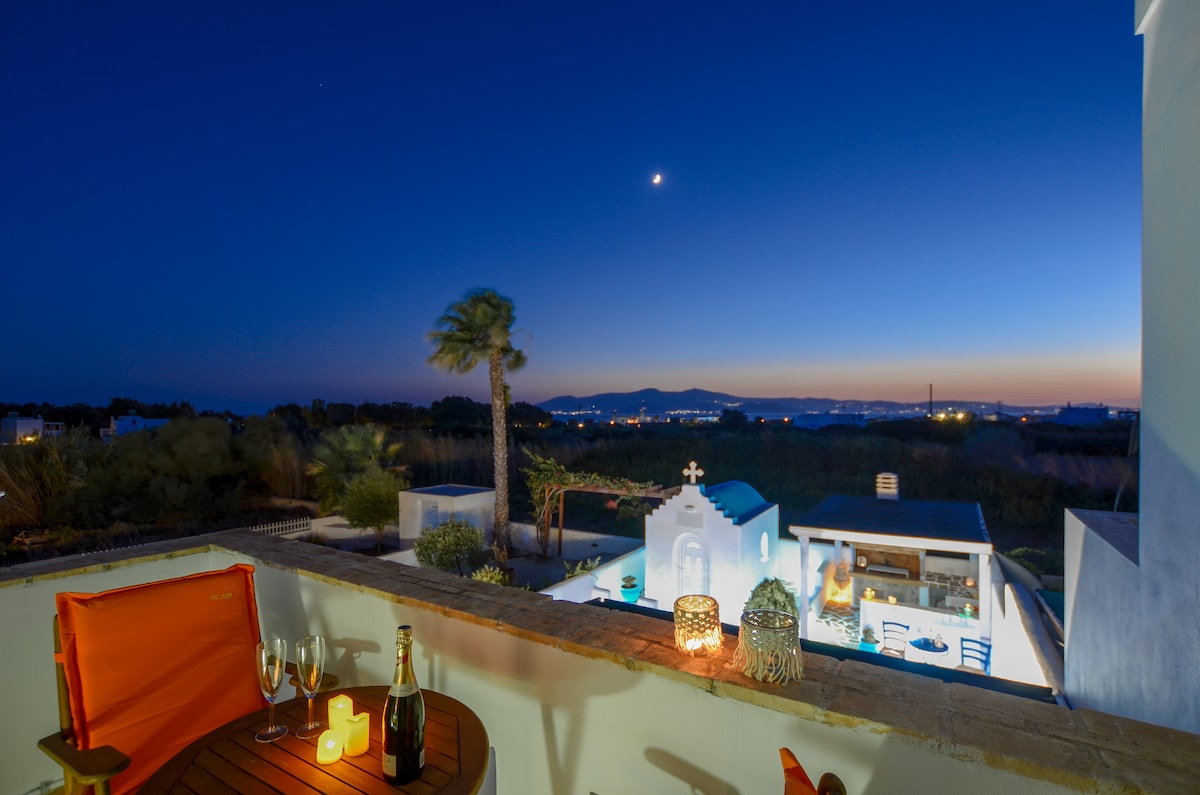 Ten, kur saulė susitinka su Mėnuliu, rasite vilą Helios ir Selene. Helios (Sun) ir Selene (Mėnulis) ilsisi ant ramios kalvos, iš kurios atsiveria vaizdas į Egėjo jūrą ir Paros salą. Jūsų rami vieta yra stebėtinai pasiekiama vos už 20 minučių kelio automobiliu nuo uosto ir miesto centro, už 15 minučių nuo oro uosto ir vos už kelių minučių nuo vienų geriausių salos paplūdimių. Kiekvieną rytą pabusite nuo paukščių garsų ir atversite akis į kvapą gniaužiančius jūros ir dangaus vaizdus.