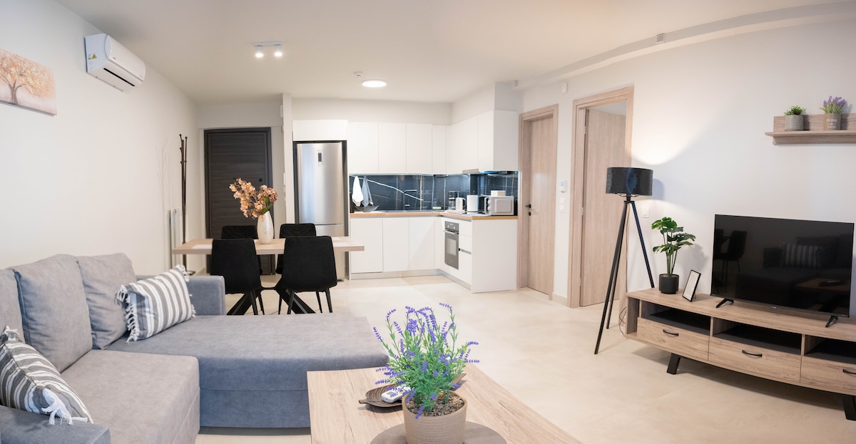 Palikite visus rūpesčius šioje erdvioje ir ramioje erdvėje, ramioje kaimynystėje, iš kurios lengvai pasieksite parduotuves, kavines ir restoranus. Vos už 270 metrų (5 minutės pėsčiomis), žemiau „Terra Petra“, rasite nemokamą viešą automobilių stovėjimo aikštelę. 💛 Atvykus jūsų laukia nedidelė naminė dovana su graikiškais produktais: šviežiais vaisiais, javainių batonėliais, Attiki medumi ir aperityvu. Šiltas svetingumo prisilietimas, kad jūsų viešnagė prasidėtų gražiai.