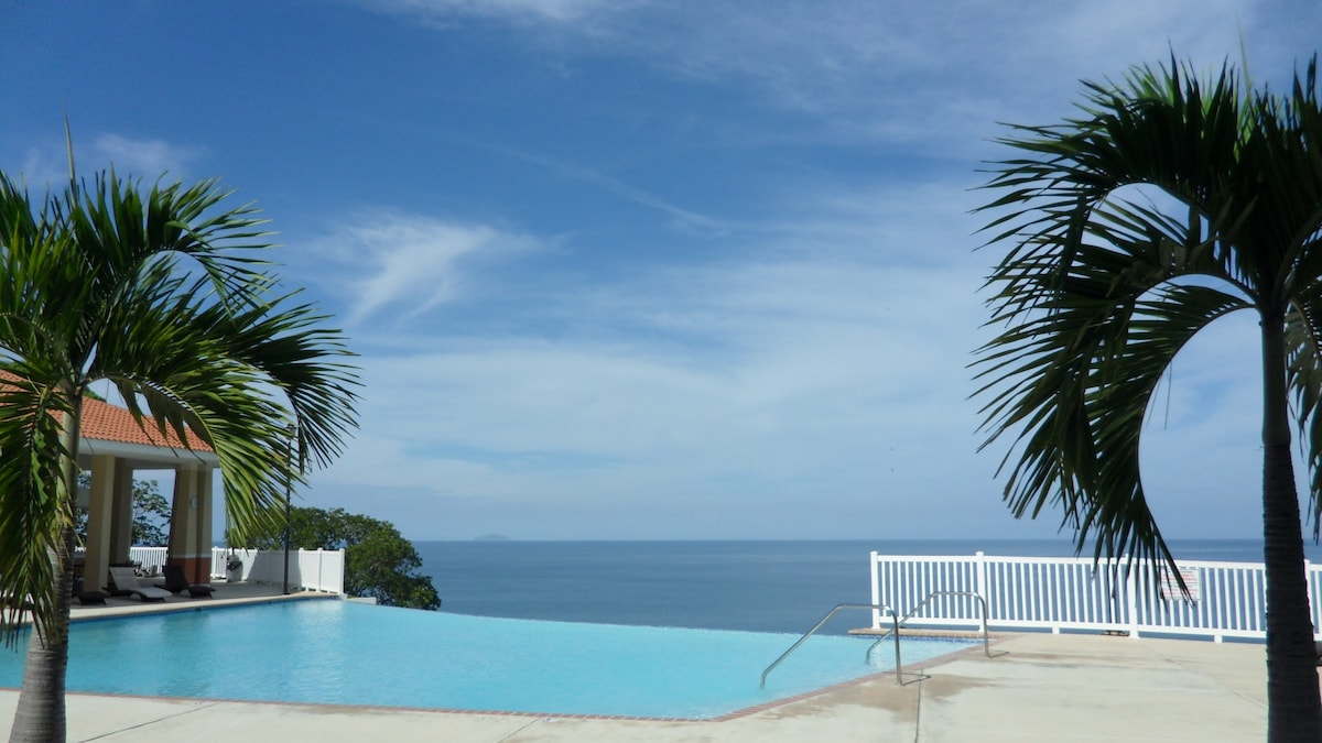 Mėgaukitės atogrąžų vėjais ir poilsio erdve prie begalinio baseino su kvapą gniaužiančiais vaizdais į Crash Boat paplūdimį, Desecheo salą ir Karibų jūrą, kur galite stebėti saulėlydį naktį. Jūs, jūsų automobilis ir daiktai yra saugūs visą parą veikiančioje bendruomenėje. Mėgaukitės vaizdu į vandenį iš balkono. Erdvi dvigulė lova pagrindiniame liukso numeryje, dvigulė lova antrame miegamajame. Karalienė išsitraukia į gyvenamąjį ir medijos kambarį Įsikūręs Aguadiloje, 5 min. iki Crash Boat Beach, 9 min. iki BQN oro uosto, 12 min. iki Surfers paplūdimio, 29 min. iki Rincon.