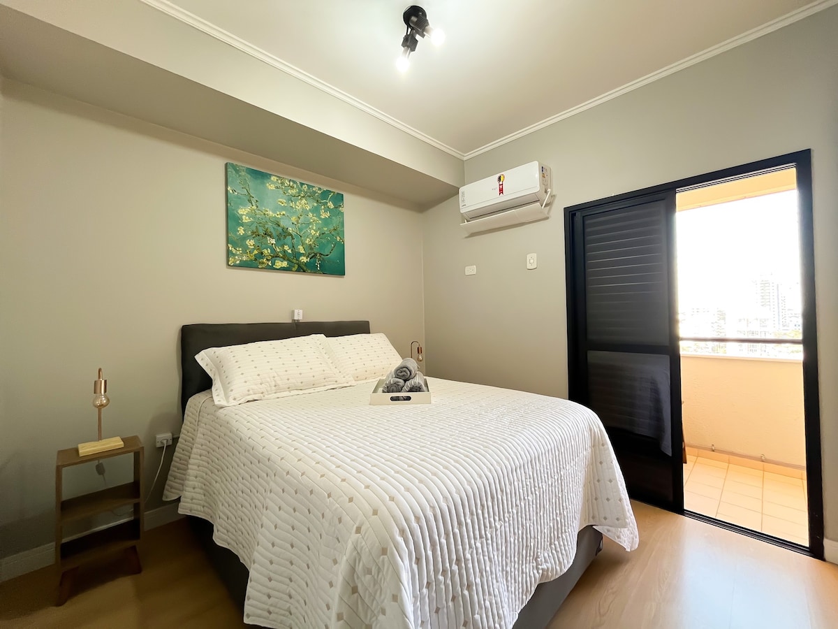 Visas butas su balkonu apartamentų viešbutyje su visą parą veikiančia registratūra! Netoli Avenida Nações Unidas, greitkelio SP300 ir Bauru Shopping. Puikūs netoliese esantys restoranai ir turgūs. Pilnai įrengta virtuvė su virykle, šaldytuvu, mikrobangų krosnele ir bendrais įrankiais. Išmanusis televizorius svetainėje ir kabelinė televizija miegamajame. Jauki vieta jūsų viešnagei Bauru!
