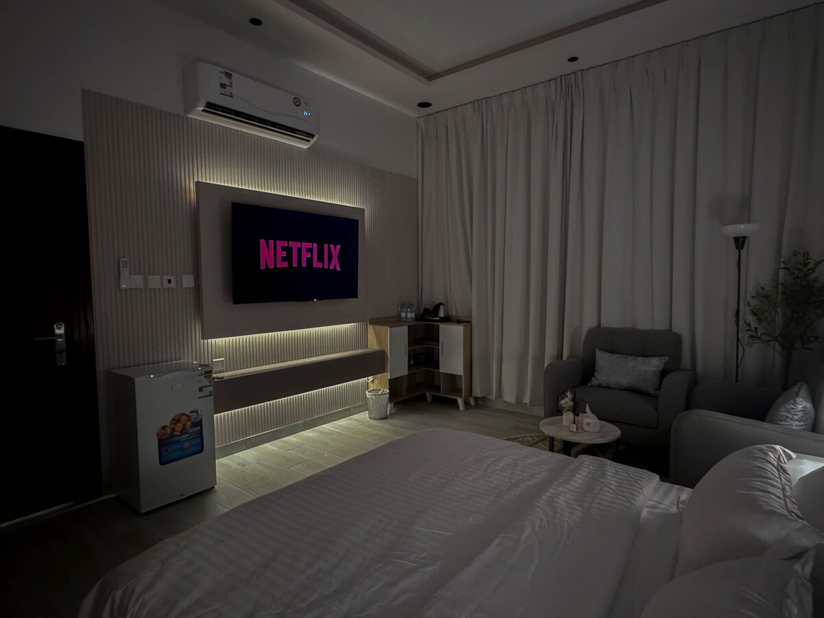 Elegantiškas 🏡 butas Al Nargyje - į šiaurę nuo Rijado Mėgaukitės patogia ir modernia viešnage puikioje vietoje netoli Abu Bakr kelio ir Karaliaus Salmano kelio, kad būtų lengviau patekti į aukščiausios kokybės vietas ir laisvalaikio vietas. 🚪 Privati prieiga Privatumas su šoniniu įėjimu, leidžiančiu patogiai įeiti ir išeiti. Išskirtinės 🎬 pramogos Išmanusis 65colių ekranas, „Netflix“ yra nemokamas, greitas internetas srautiniam perdavimui be kapojimo. Privatus 🌿 parkas Mėgaukitės ramia atmosfera privačiame sode, suteikiančiame grožį. Gražios ✨ detalės Kruopščiai apgalvotos detalės suteikia rafinuotumo kiekvienam būsto kampeliui, todėl viešnagė čia yra išskirtinė.