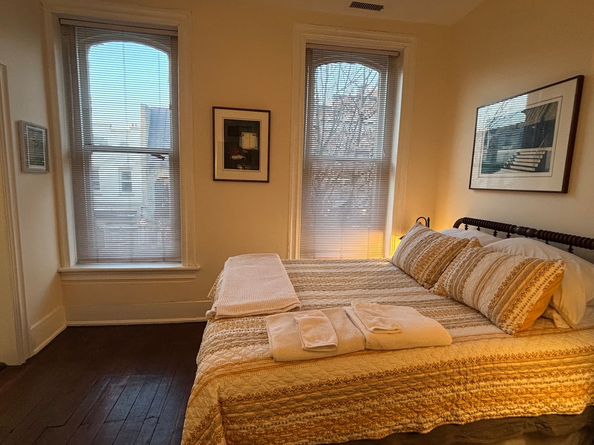 Puiki atvira erdvė 1-2 svečiams. Patogi karališko dydžio lova, sofa, darbo erdvė, mini šaldytuvas, mikrobangų krosnelė, elektrinis virdulys ir Keurig (bet ne visa virtuvė). Privatus įėjimas, erdvė rūsyje ir privatus vonios kambarys. Netoli nuostabių restoranų/ barų. Apie 15 min. pėsčiomis iki žaliosios metro linijos. Pastaba: nors apartamentai yra privatūs ir uždaryti pagrindiniams namams, namuose yra 2 katės - tai alergiškiems žmonėms. Be to, tai senas, sujungtas namas su originaliomis grindimis, todėl nepralaidus garsui.
