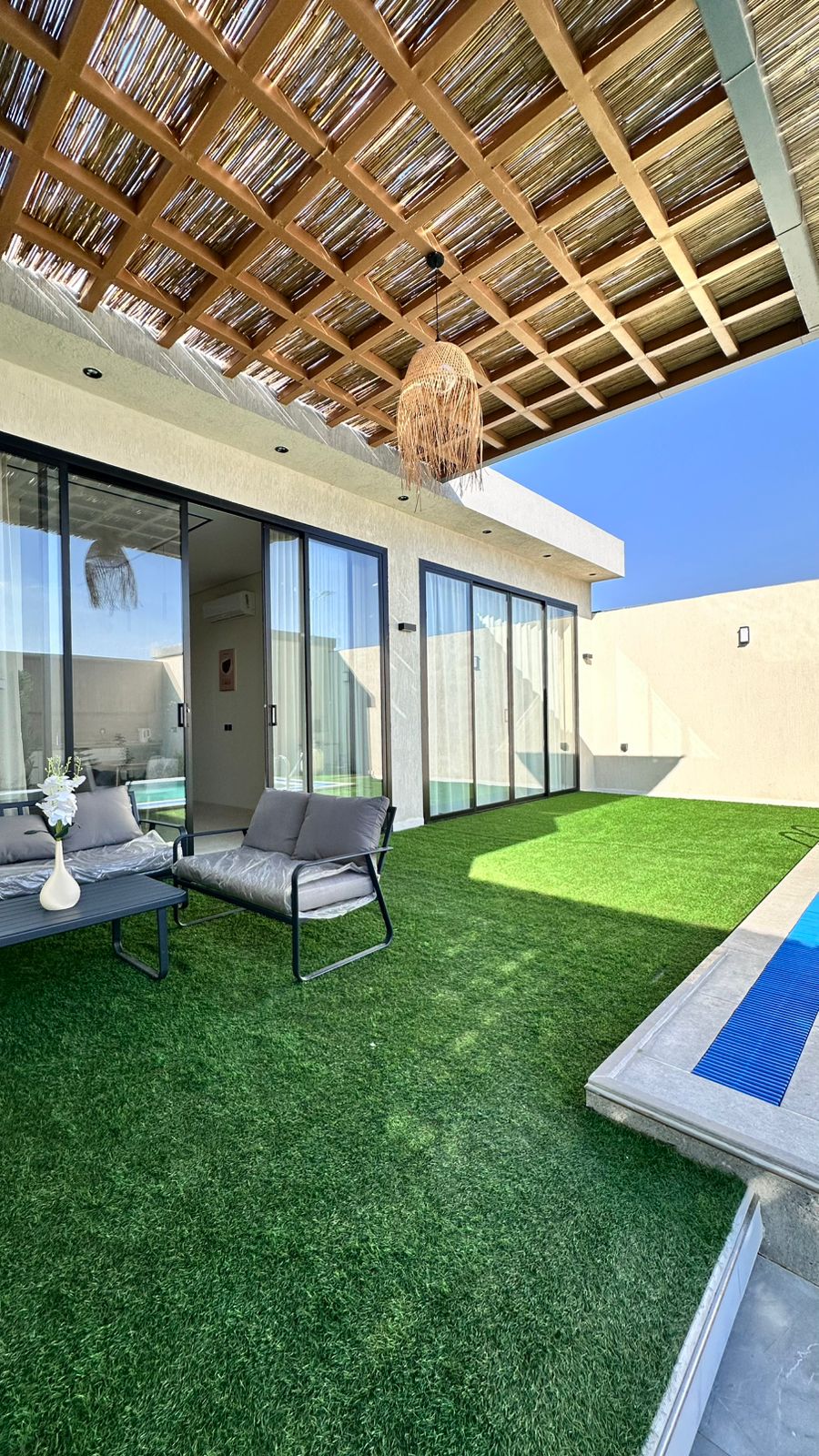 Poilsio namelis su miegamuoju, iš kurio atsiveria vaizdas į baseiną ir lauko sėdimąsias vietas.