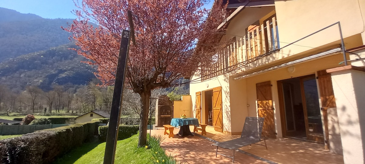 idealioje vietoje, priešais kalnus, 900 m2 sklypas, šešėliuota terasa, į pietus. Naujas namas. viryklė su mediena. Rami ir raminanti vieta. Wi-Fi Pirmame aukšte: 1 didelė svetainė su 1 įrengta virtuve su centrine sala 8 asmenims, 1 stalas 6 asmenims, 1 tualetas, 1 vonios kambarys. 1 miegamasis. Viršuje 3 miegamieji, 1 vonios kambarys/WC, 1 didelė svetainė, padalyta į dvi dalis dėl užtemdančių užuolaidų, kad būtų sukurtas miegamasis su patogiu spragtelėjimu ir . Sofa-lova, televizorius, knygos ir žaidimai.