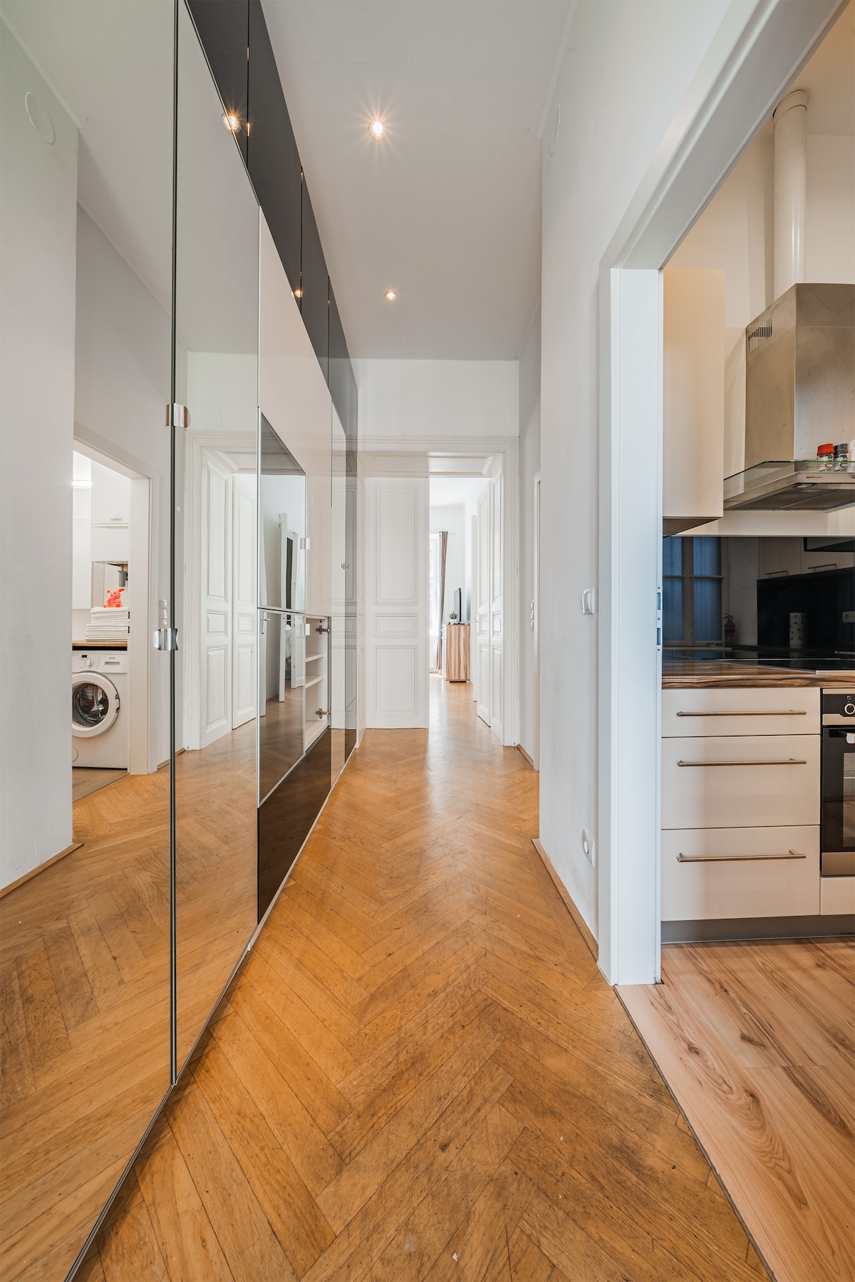 Puikus butas istoriniame pastate, 1909 m., paskutinis aukštas su dviem stogo deniais, panoraminiais vaizdais ir puikia natūralios šviesos atmosfera, erdvūs kambariai su aukštomis lubomis, kabelinė televizija, WI-FI, atvira svetainė su virtuve ir poilsio kambarys svečiams Vienoje. Parketas. Erdvus vonios kambarys su vonia. Tualetas papildomame kambaryje. Labai žavinga vieta vienoje iš gražiausių Vienos vietovių, kurioje gausu istorijos (muziejai, restoranai, barai). Netoli miesto centro.