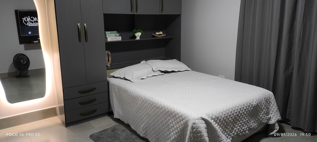 Modernus ir jaukus butas Amerikoje, iš kurio atsiveria privilegijuotas vaizdas į Avenida Brasil. Idealiai tinka iki 2 žmonių, jame yra patogi lova, oro kondicionierius, belaidis internetas ir pilnai įrengta virtuvėlė. Kondominiume yra baseinas, žaidimų kambarys, skalbykla ir stovėjimo vieta 1 automobiliui. Puiki vieta, netoli restoranų, kepyklų, vaistinių, sporto salių ir laisvalaikio zonų. Praktiškumas, komfortas ir saugumas viešnagės metu!