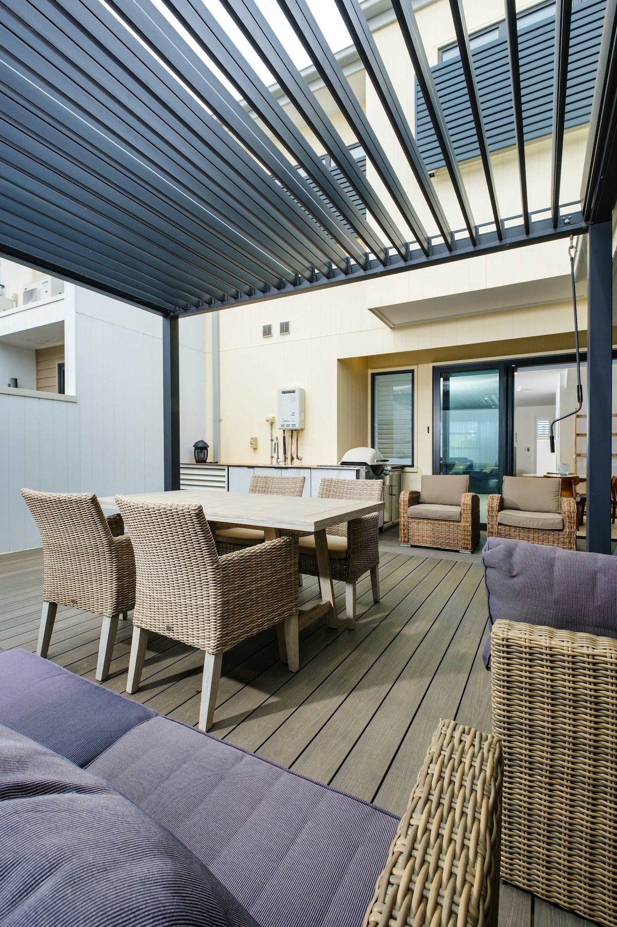 Mėgaukitės stilingu potyriu šiame centre esančiame dviejų miegamųjų dviejų vonios kambarių name su 10 sūkurine vonia ir privačiu balkonu bei kiemu. Šis idealaus stiliaus miesto namas yra vos už kelių žingsnių nuo The Terrace Street valgomojo, prekybos centro ir paplūdimio (500 m). Prekybos centras ir kepykla už minutės kelio pėsčiomis. Pilnai įrengta virtuvė, skalbykla ir nemokamas neribotas BELAIDIS INTERNETAS ir patalynė - visa tai skirta patogiai viešnagei. Saugi privati automobilių stovėjimo aikštelė po priedanga. Griežtai draudžiama rengti vakarėlius ir rūkyti draudžiama.