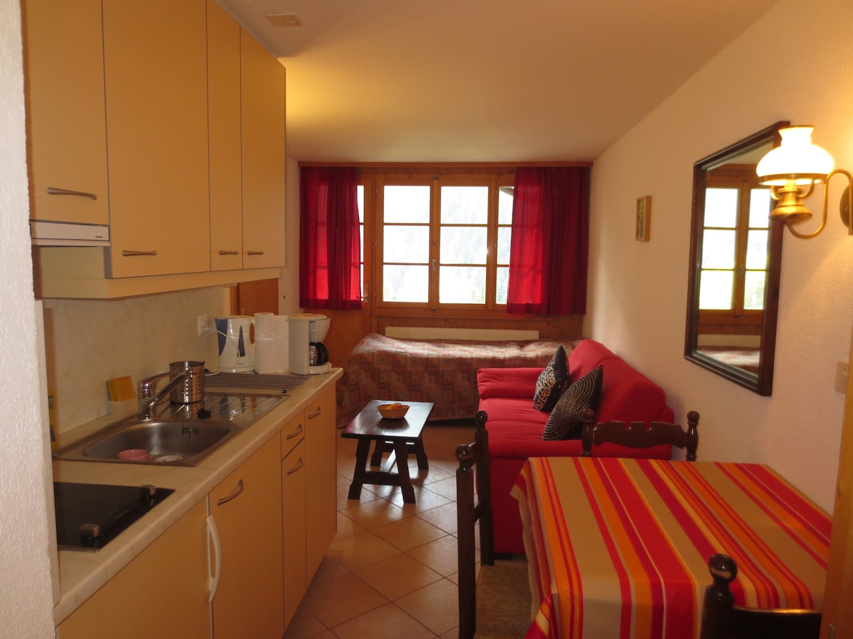Studija yra senoje mūsų sodybos arklidėje. Jis neseniai buvo renovuotas ir jame yra 140 cm lova, vonios kambarys su dušu, valgomojo zona, privati terasa ir virtuvėlė. Namelis yra virš Mase kaimo, 1600 m aukštyje, Mayens vietovėje, miško pakraštyje. Vaizdas į Val d'Hérens yra kvapą gniaužiantis... Iš trobelės galima pradėti daugybę žygių. Artimiausias slidinėjimo kurortas yra Naksas, už 10 minučių kelio automobiliu.