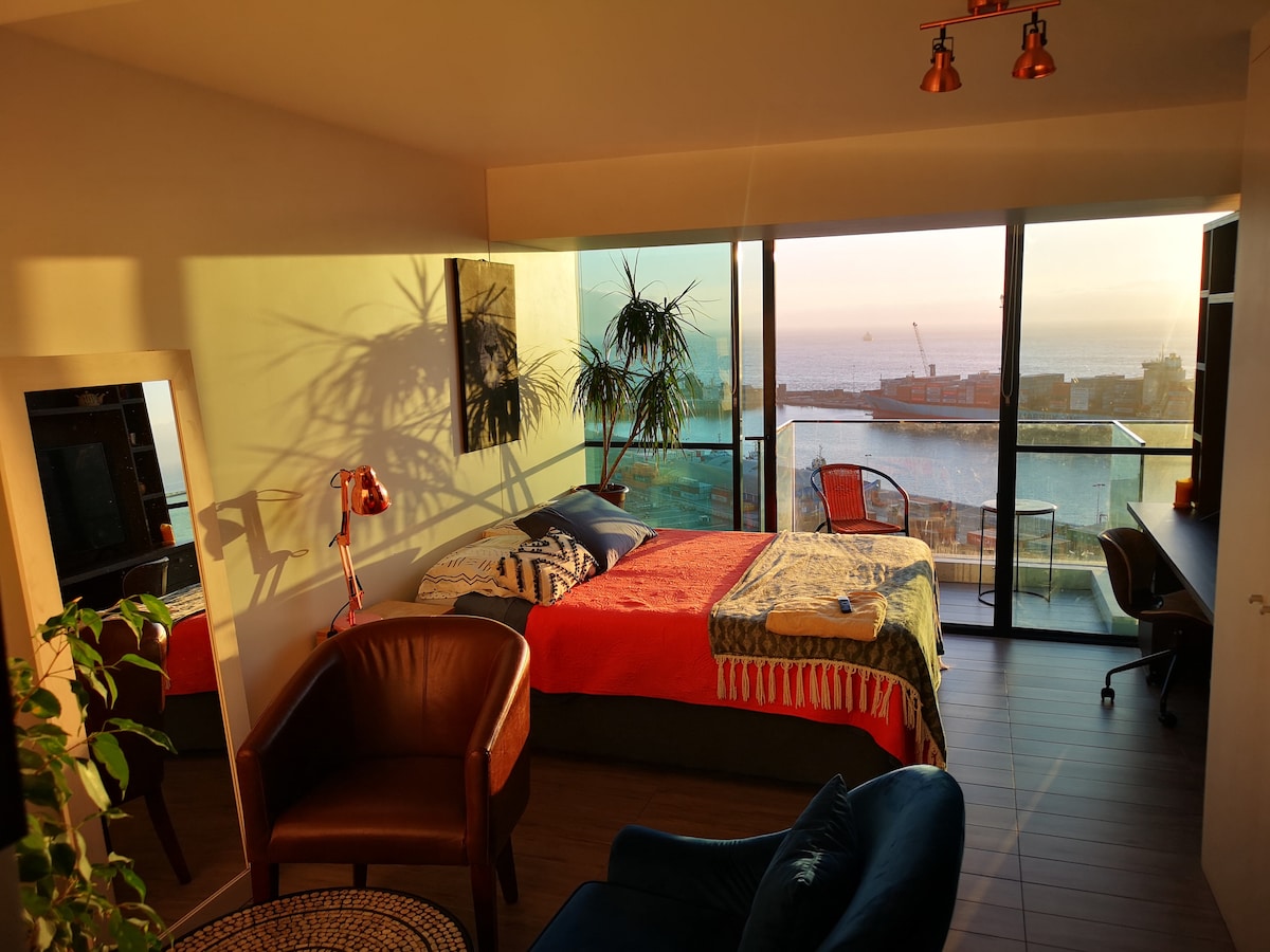 Erdvus butas, idealiai tinkantis svečių priėmimui darbui arba pilnai įrengtoms atostogoms, iš kurių atsiveria nuostabus panoraminis vaizdas į jūrą priešakinėje linijoje. Esame vos už kelių žingsnių nuo „Lider Express“, sporto salės, vaistinių, degalinės, barų („Ciragan“, „Papa John's“, „Niu sushi“), kavinės, autobusų stoties ir regioninės ligoninės, taip pat vos už 7 minučių kelio automobiliu nuo prekybos centro „Antofagasta“. Sveikiname jūsų augintinius, mes DRAUGIŠKI AUGINTINIAMS 🐶