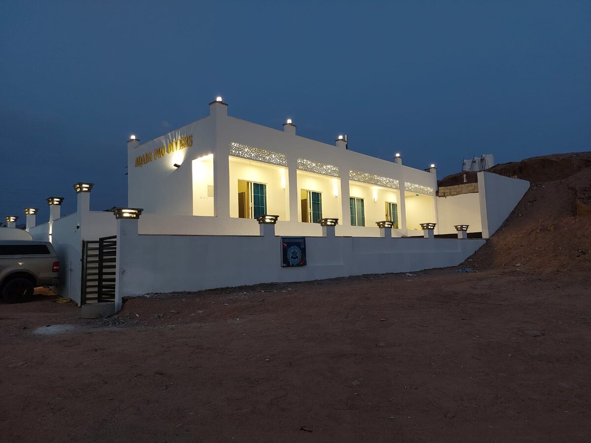 Čia jūsų laukia jūsų namai toli nuo namų. Jaukus ir patogus apsilankymas Akaboje Raudonojoje jūroje su itin karališko dydžio lova ir atpalaiduojančiu privačiu balkonu su vaizdu į kalnus ir jūrą. Iki pasimatymo. Vieta: *Akabos oro uostas: 8 km * Prekybos centras miesto centre: 10 km *Artimiausias paplūdimys (vieša prieiga / mokami kurortai): 10 kilometrų *Pietų paplūdimys, nardymo ir snorkeliavimo vieta: 17 kilometrų *Turgus, vaistinė, kepykla, „Counter Takeaway Food“, maisto prekės: 300 metrų
