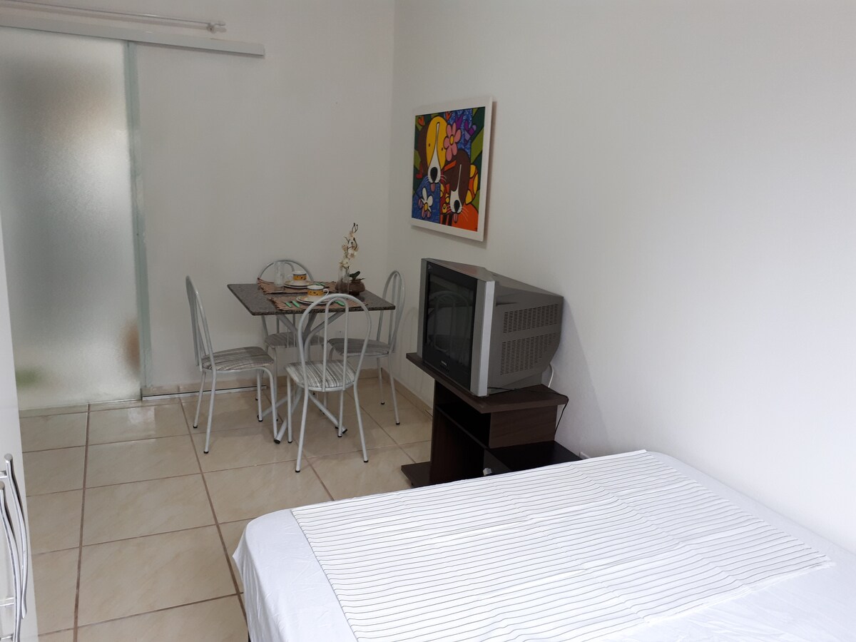 O Studio possui cozinha e quarto integrado, sacada e banheiro. Andar alto com elevador. Uma vaga de garagem. Próximo a rodoviária. Possui uma cama de casal Queen (colchão magnético), com opção de + 1 colchão de solteiro no chão (com cobrança de taxa extra p/ o 3°hospede). *Para que a reserva seja efetivada é necessário informar o nome de todos os hóspedes. O congelador pode não estar disponível, pois utilizamos o apto quando não há reservas. NÃO ACEITAMOS RESERVAS DESTINADAS A ENCONTROS!