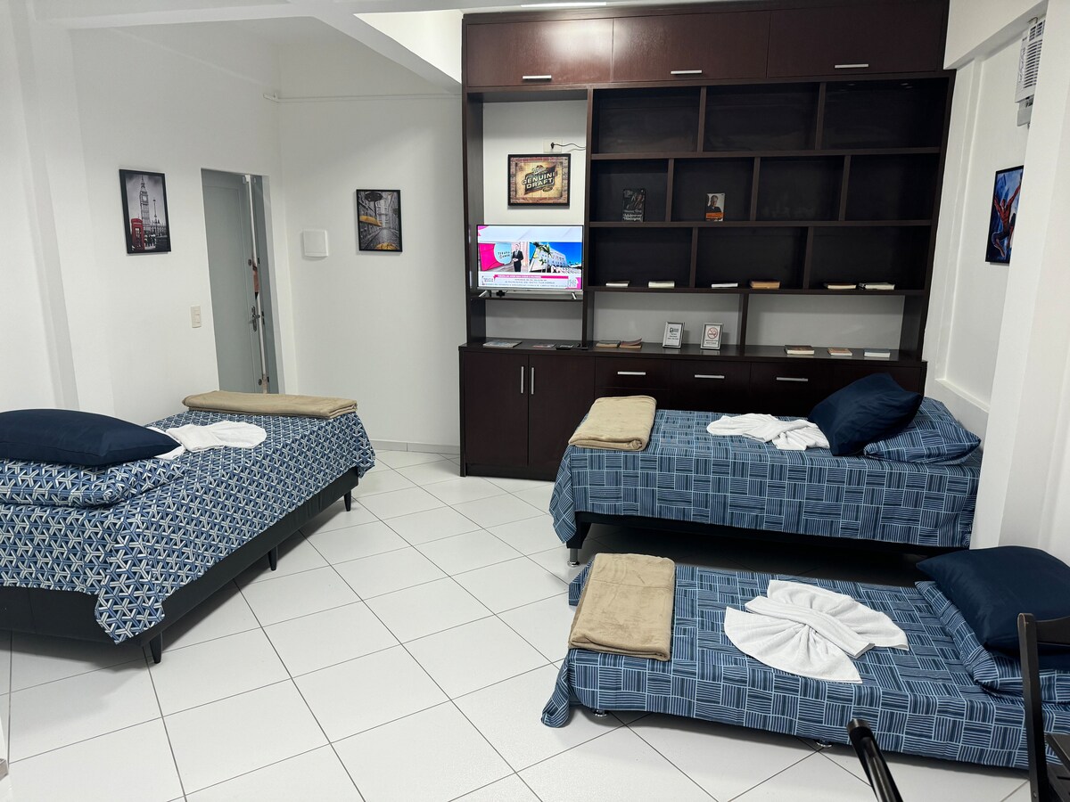 Išskirtinis svečio privačios studijos tipo butas Dvigulė lova + sofa Patalynė dviems žmonėms. Apstatyta ir įrengta. Enxoval Full. Muilas ir šampūnas Pilnai įrengta virtuvė Išmanioji televizija 40col. vietiniai kanalai 02 liftai Privatus garažas Savarankiškas atvykimas - Netoli Didžiosios Britanijos (10 min. pėsčiomis) Centrinis regionas -Máquina Lava/Seca (mokama pastate) - Papildomas mokestis už patalynės (lovos/vonios) keitimą viešnagės metu - Papildomas mokestis virš 2 svečių Dėl neteisėto erdvės naudojimo gali būti taikomos nuobaudos