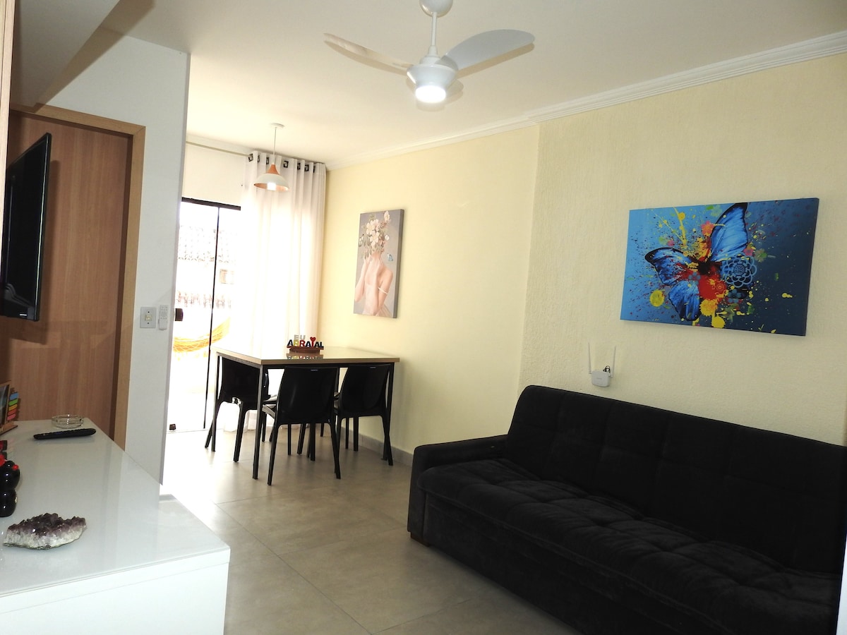 Kondominiumas yra priešais Praia Grande - vieną gražiausių ir gerai įrengtų paplūdimių mieste. Butas yra jaukus, su svetaine 2 aplinka, valgomuoju stalu, sofa-lova, ištraukiama viengule lova ir išmaniuoju televizoriumi, 1 miegamuoju su dvigule lova, suplanuotomis spintelėmis ir televizoriumi, vonios kambariu su dėže, pilna virtuve, lubomis ir oro kondicionieriaus ventiliatoriais miegamajame ir svetainėje, didelės spartos internetu (Wi-Fi) ir dengtu garažu 2 automobiliams. Yra pagalvių, patalynės ir rankšluosčių.