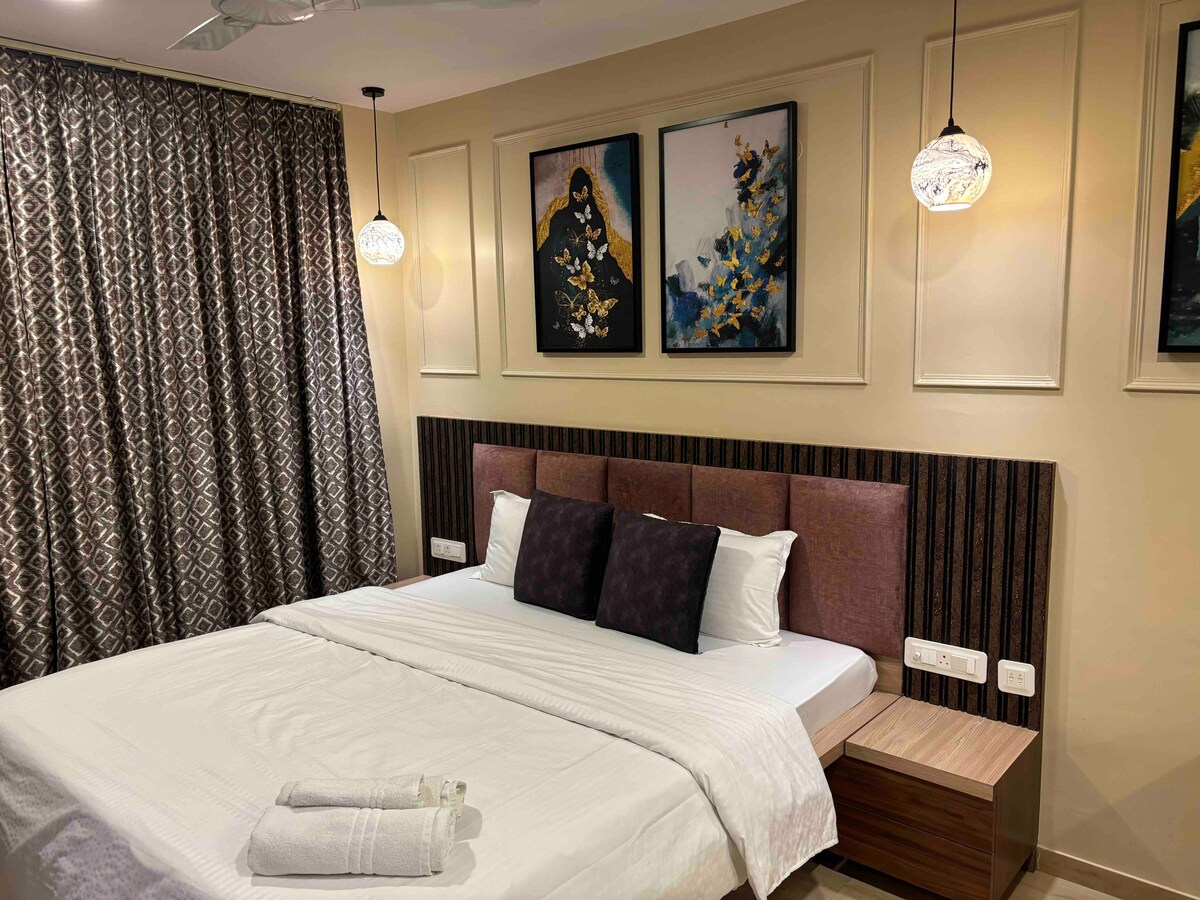 Mėgaukitės patogia ir stilinga viešnage šiuose moderniuose, erdviuose 1BHK prabangiuose apartamentuose, apgalvotai suprojektuotuose taip, kad juose galėtų apsistoti iki 4 svečių. Patogi karališko dydžio lova, o svetainės zonoje yra karališko dydžio sofa-lova, todėl ji idealiai tinka šeimoms, poroms ar mažoms grupėms. Bute yra du aukščiausios klasės vonios kambariai, užtikrinantys patogumą ir privatumą. Pilnai įrengta virtuvė leidžia lengvai gaminti maistą ir išeiti į ramią lauko poilsio zoną, puikiai tinkančią rytinei arbatai.