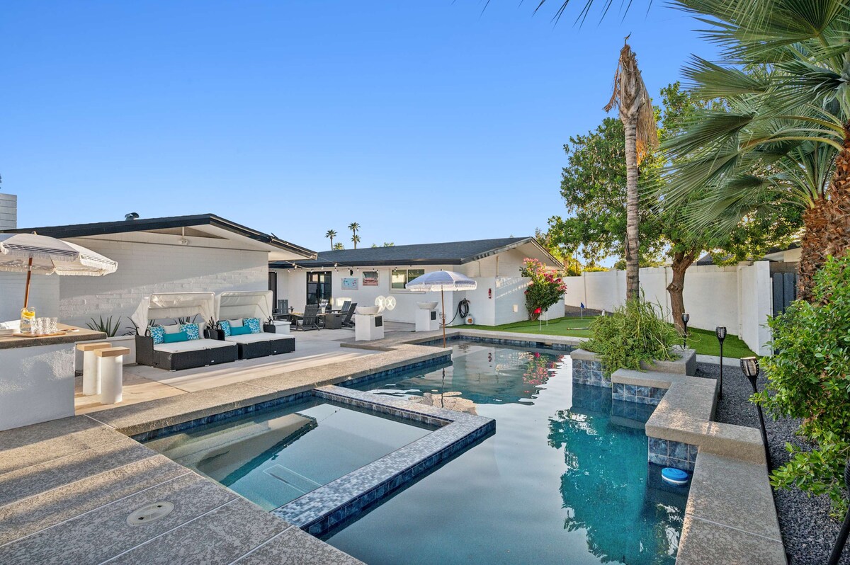 THE most EPIC Wellness Retreat in all of Scottsdale! Welcome to our luxurious 4-bed, 2-bath GETAWAY nestled in the heart of Scottsdale! You've discovered the #1 destination for Health/Wellness. Just 2 miles from the vibrant "Old Town" and a short drive to the ASU. Key Amenities: -Full Service Gym -"Plunge" XL Sauna -"Plunge" Cold Plunge -Lux Memory Foam King Mattresses -Sonos Sound System -Large Pool -Fire Pit -Putting Green -Corn-Hole Lane & Boards -Water-Volleyball -Ping Pong Table