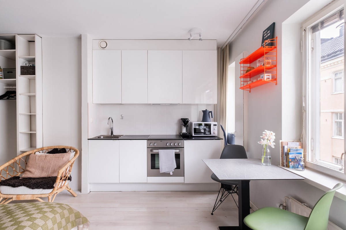 Mėgaukitės viešnage šioje gražioje ir pilnai įrengtoje miesto studijoje Punavuori dizaino rajone *** 23 m2 stilingi namai su dizaino interjeru *** Greitas Wi-Fi ir Netflix *** Puiki vieta su daugybe kavinių, restoranų, parduotuvių ir kt., 10 min. pėsčiomis nuo miesto centro ir jūros *** Lengva pasiekti, puikus susisiekimas viešuoju transportu, 1 min. pėsčiomis iki autobusų ir tramvajų stotelės