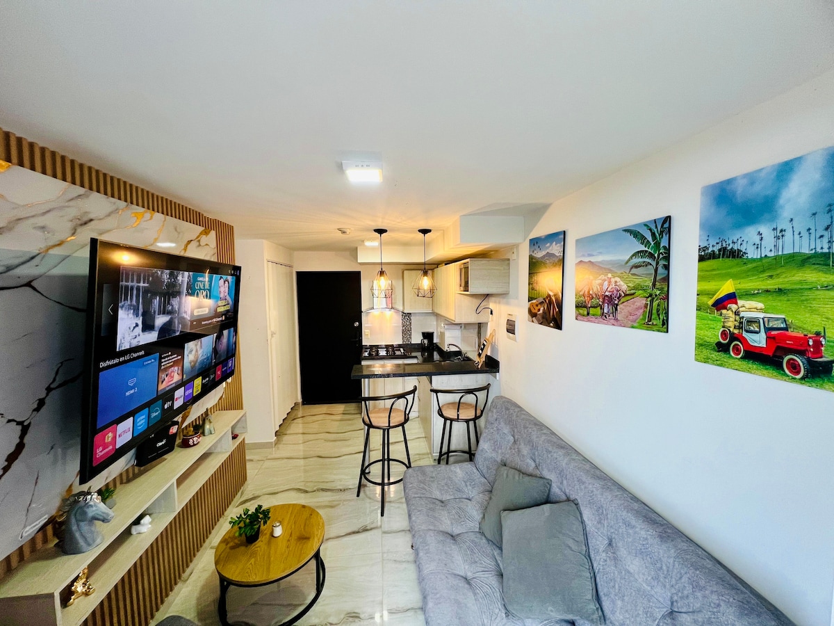 🏡 Modernus 6-o aukšto butas su 2 miegamaisiais ir 2 vonios kambariais (vienas atskiras kambarys). 🛏️ Miegojimo vietų išdėstymas: Pagrindinis miegamasis: dvigulė lova + ištraukiama dvigulė lova. Miegamasis Nr. 2: dvigulė lova + viengulė lova. Svetainė: dvigulė sofa-lova. 🌟 Puiki vieta netoli Parque del Café, PANACA, Salento ir Filandia. 💎 Baseinas, sūkurinė vonia, garinė pirtis, sporto salė, privati automobilių stovėjimo aikštelė ir dar daugiau. ✨ Užsisakykite dabar ir mėgaukitės geriausia patirtimi Quindío!