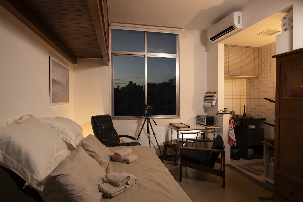 The studio has air conditioning, in a privileged area of Ipanema, on the border with Copacabana. Two and a half blocks from Ipanema beach and four short blocks from Copacabana beach. Subway, 24-hour cafeteria, 24-hour pay parking beside the building, laundries, restaurants, drugstores, supermarkets, all very close one or two blocks away! 24-hour doorman, elevator, but no garage (as mentioned above, there is a 24-hour parking lot next door). Cable TV, wi-fi, well equipped kitchen, fridge.