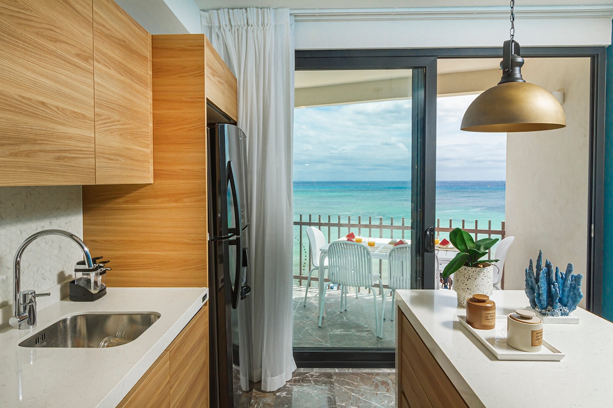 Gražus 2 miegamųjų butas paplūdimyje. Atsibuskite su gražiu saulėtekiu tiesiai iš savo miegamojo. Mėgaukitės balkonu/terasa, baseinu, sūkurine vonia, pilnai įrengta virtuve ir privačiu paplūdimio klubu, kad viešnagė būtų labiausiai atpalaiduojanti. „Elements“, „Oceanfront“ ir „Beachside Condo Hotel“, puikiai įsikūrusi paplūdimyje, yra vienintelis privatus paplūdimio klubas „Playa Del Carmen“! Tai tik „The Elements“ svečiams skirtas paplūdimio klubas, kuriuo galite naudotis nemokamai. Ten galite nusipirkti gėrimų arba pasiimti savo.