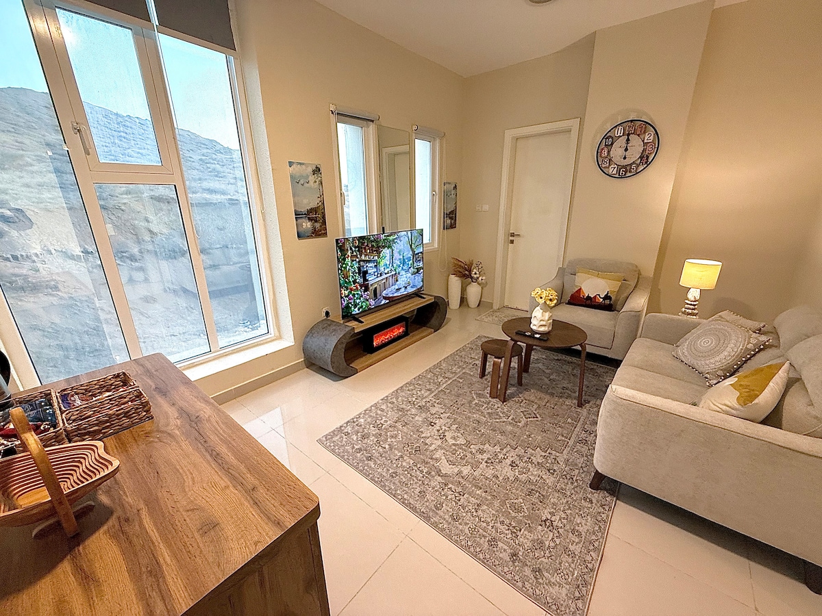 Išskirtinis, pilnai įrengtas 2 miegamųjų butas (vaizdas į kalnus), esantis didingoje Muscat įlankos bendruomenėje. Puikiai tinka šeimai ar draugams, norintiems ramiai apsistoti vaizdingame Maskato įlankos grožyje. Įsikūręs šalia viešbučio „Jumeirah“ ir privatus priėjimas prie įlankos, baseino, žaidimų aikštelių ir vaikų parko.