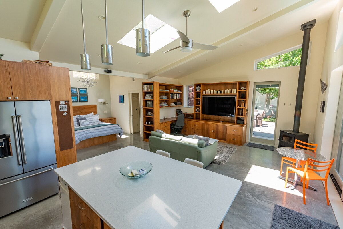 Šviesi, šviesi ir tiesiog nuostabi, ši žavinga studija yra vos už dešimties minučių kelio nuo festivalio centro ir yra puiki vieta pasimėgauti Pietų Oregonu. Įsikūręs į ramų rajoną istoriniame geležinkelio rajone. Erdvėje yra prabangi karališka lova. Vonios kambarys su dušu ir vonia, židinys, plokščiaekranis išmanusis televizorius, skalbyklė/džiovyklė ir virtuvėlė. Didelė privati vieta pastatyti automobilį prie pat durų ir uždengtoje terasoje yra valgomojo zona ir kepsninė. Dizainerio įkvėpimas.