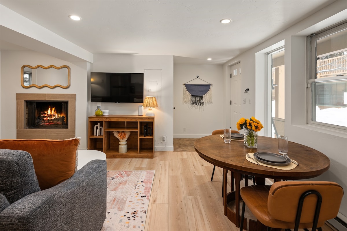 Vieta, vieta, vieta! Mėgaukitės šiuo atviros koncepcijos kondominiumu Aspeno kalno papėdėje. Po dienos ant kalvos (slidinėjant ar žygiuojant pėsčiomis) grįžkite į šį jaukų kondominiumą šiek tiek laiko, praleisto be kojų. Atsipalaiduokite prie dvipusio židinio, šildančio ir miegamąjį, ir svetainę. Bute yra labai patogi karališko dydžio lova, karališko dydžio sofa-lova, skalbyklė ir džiovyklė bei atnaujinta, pilno dydžio virtuvė. Mėgaukitės komfortu, kurį suteikia 2 naujai įrengti mini oro kondicionieriai.
