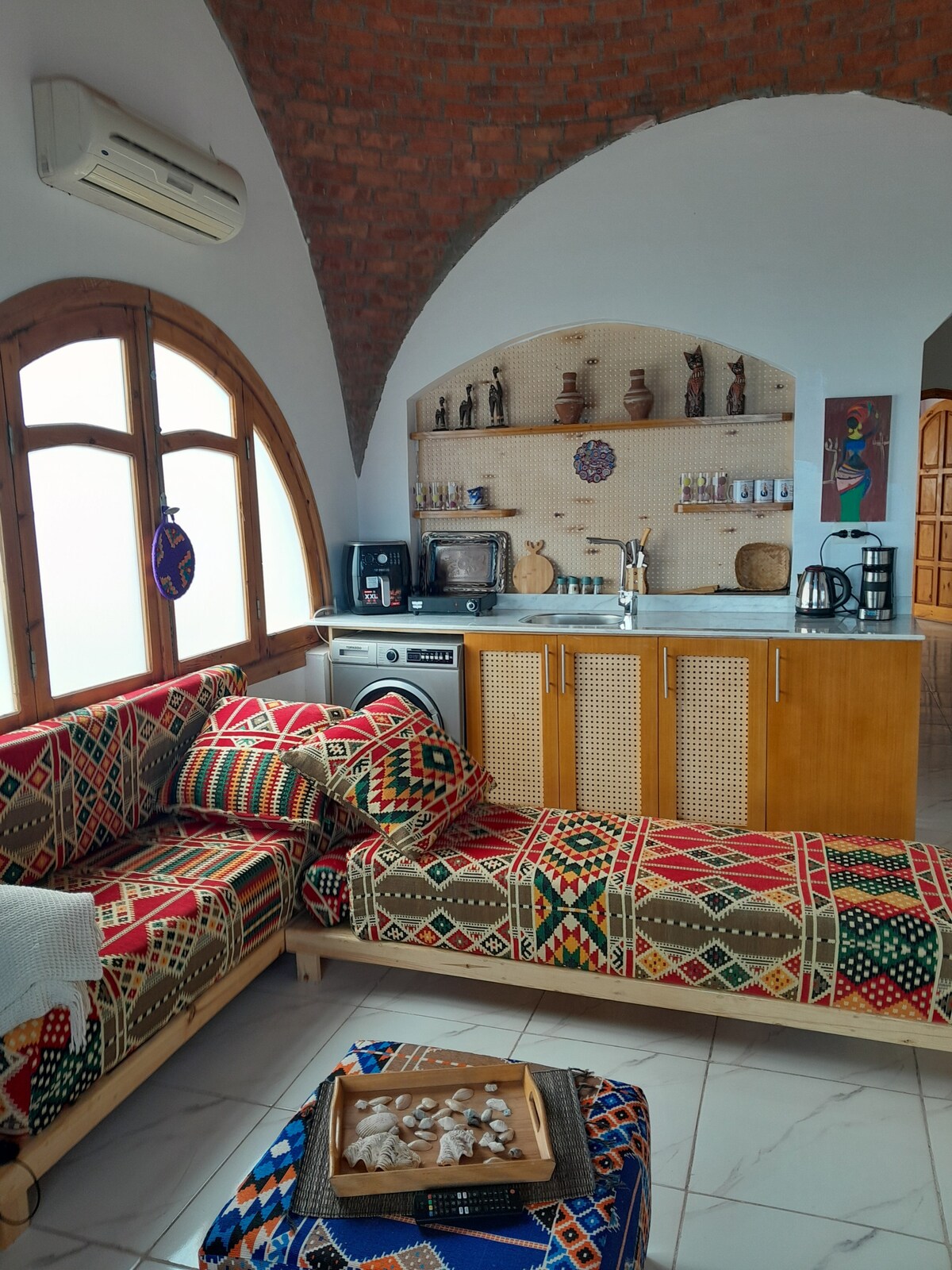 Enjoy a luxurious stay in this beautiful 2-bedroom apartment offering breathtaking sea views and a panoramic view of Hurghada city center. Surrounded by 5-star hotels, caf s, restaurants, bars, and beach clubs, this property is ideal for families or groups looking for comfort, convenience, and a true Red Sea experience. The Space -2 bedrooms and 1 bathrooms -1 lounge areas for relaxing or entertaining Nobean-style kitchen, fully equipped seaview balcony featuring an outdoor bar and coffee table -Private backyard with dining area, BBQ, and green garden space -No elevator access (property located in a low-rise building) Key Features -Incredible sea and city views -Private beach access (paid) and swimming pool 30m from the compound -Homemade meal service available cooked by a local chef with European, Italian, Egyptian, or Moroccan cuisine -Organic and healthy options made fresh daily -Special diets available (allergies, gluten-free, etc.) -Meals delivered to your doorstep 8 13 per person for a two-course meal -Electricity billed separately (pay-as-you-go card system) -Diving tours available, including day and overnight trips to Sharm El Naga, one of Hurghada s best dive sites -Recommended nearby restaurant: Barbouni Seafood, opposite Sunrise Holiday Hotel Guest Information -Electricity is not included in the accommodation rate; guests can top up as needed -No elevator in the building -Only married couples of Egyptian or Arab nationality can be accepted (per local regulations) Any group of 5 peoples to 6 people's we can accommodate them with 2 flats with connections door btween the 2 flat for more privacy.. House Rules -Check-in: 2:00 PM | Check-out: 11:00 AM -No smoking indoors -No pets