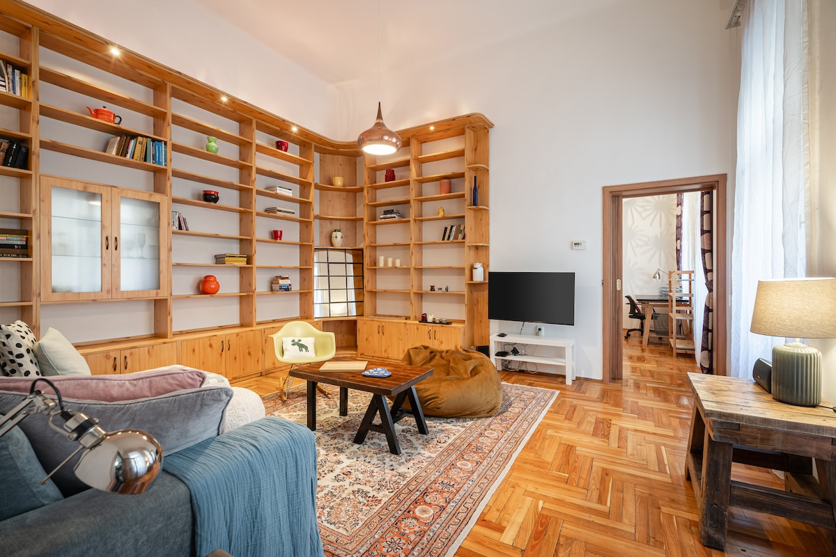 Pasinerkite į praeitį šiuose atnaujintuose istoriniuose namuose. Bute yra eglutės medinės grindys, spalvotos spalvos, plačios gyvenamosios erdvės, antikvariniai baldai ir dekoras bei keli prancūziški balkonai. Keturių kambarių butas yra 120 m2/ 1292 kv. m. Ft. Jame yra du vonios kambariai: vienas su vonia/dušu, kriauklė ir tualetas, kitas su dušu ir kriaukle, taip pat dar vienas atskiras tualetas. Būstas yra pačioje rūmų rajono širdyje, jame yra gražių senų pastatų, bibliotekų ir meno galerijų. Vos už 5 minučių kelio pėsčiomis nuo Lörinc Pap aikštės su daugybe restoranų, barų ir terasų. Per 10 minučių rasite nacionalinį muziejų ir gražius Wenckheim rūmus, kuriuose yra viena didžiausių miesto bibliotekų. Didžiausias maisto ir produktų turgus - Didžioji turgaus salė - yra tik 15 minučių pėsčiomis, taigi Dunojaus upės pakrantė (Fovamo aikštė).
