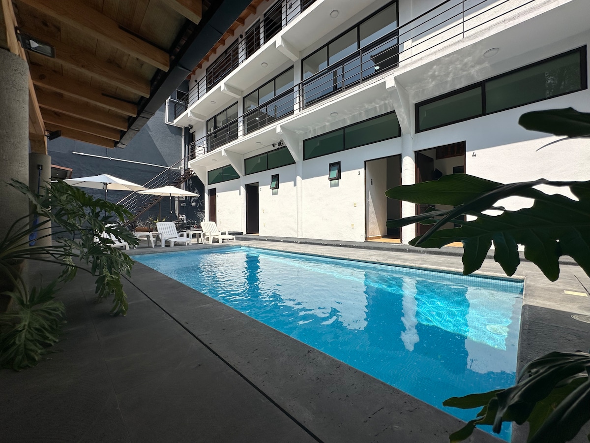 Atraskite savo prieglobstį Valle de Bravo! Šiame jaukiame kambaryje yra baseinas, kepsninė, laužavietė ir NAUJI PATOGUMAI... lauko orkaitė picoms!, puikiai tinkanti mėgautis gamta. Atsipalaiduokite lauko valgomajame, lovose, hamake ir ragelyje šalia baseino. Įsikūrę centre, būsite už kelių žingsnių nuo restoranų, barų ir parduotuvių, tokių kaip Chedraui ir Liverpool. Puiki vieta atsipalaiduoti ir pažinti Valle de Bravo!