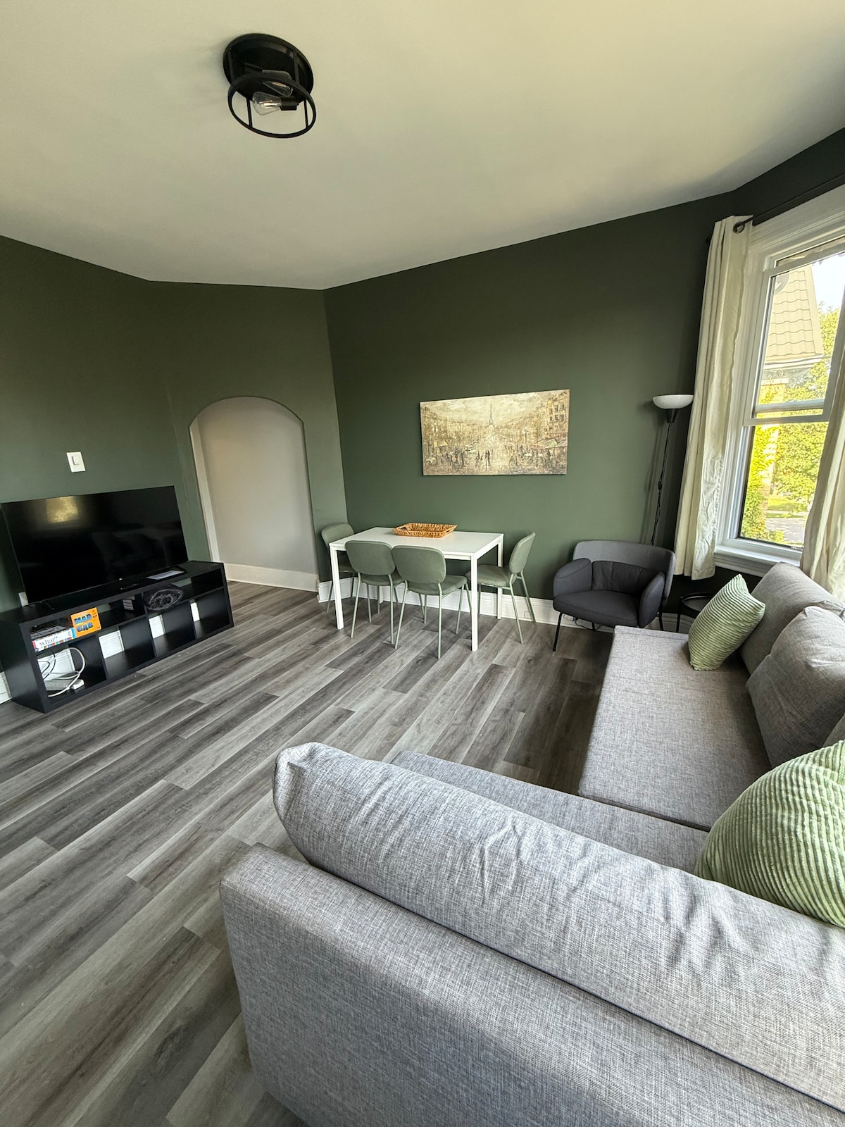Enjoy your experience at this centrally located and charming one bedroom apartment in a historical century home. This tastefully renovated unit is spacious, equipped with a full kitchen, and dedicated workspace in the large bedroom. Conveniently features unlimited high speed internet, Smart TV, and secure keyless entry. Parking available at the back for 1 vehicle. The bedroom features a comfortable king sized bed, dedicated workspace, and room darkening shades.
