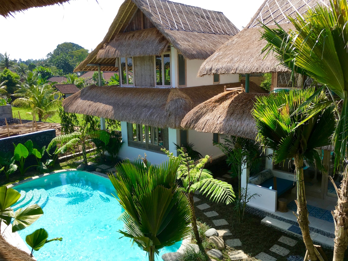 Puikiai tinka poroms ar dviem draugams, kurie keliauja kartu ieškodami vietos apsistoti gamtoje su vaizdu į džiungles ir ryžių terasą. Apsistoję pas mus turėsite puikią galimybę prisijungti prie mūsų Balio gyvenimo būdo. Galite prisijungti prie mūsų ūkyje ir prisijungti prie mūsų vietinio kaimo ceremonijos. Pats namas pastatytas naudojant seną perdirbtą medieną su unikalia senovine ypatybe. Jame taip pat yra privatus bekraštis baseinas ir virtuvė . Įskaičiuoti pusryčiai. Kitas maistas gali būti tiekiamas už papildomą mokestį.