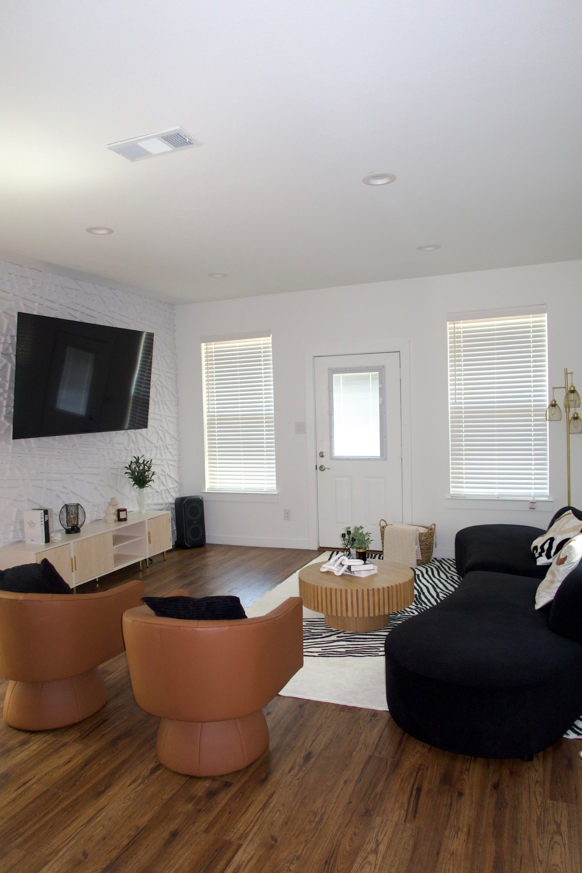 Gražūs namai yra centrinis oras ir šildymas, skalbyklė, džiovyklė, šaldytuvas, indaplovė ir viryklė maisto ruošimui. Jame taip pat yra du 70 colių, 65 colių televizoriai, taip pat 30 colių televizorius. Kabelinė televizija nemokama. Namuose yra du vonios kambariai ir du miegamieji. Pagrindiniame miegamajame yra karališko dydžio lova, svečių dvigulė lova ir ištraukiama sofa-lova. Namas yra apsaugotas ADT apsauga, o prie įėjimo yra durų skambučio kamera ir išmanioji spyna, skirta savarankiškam įėjimui.
