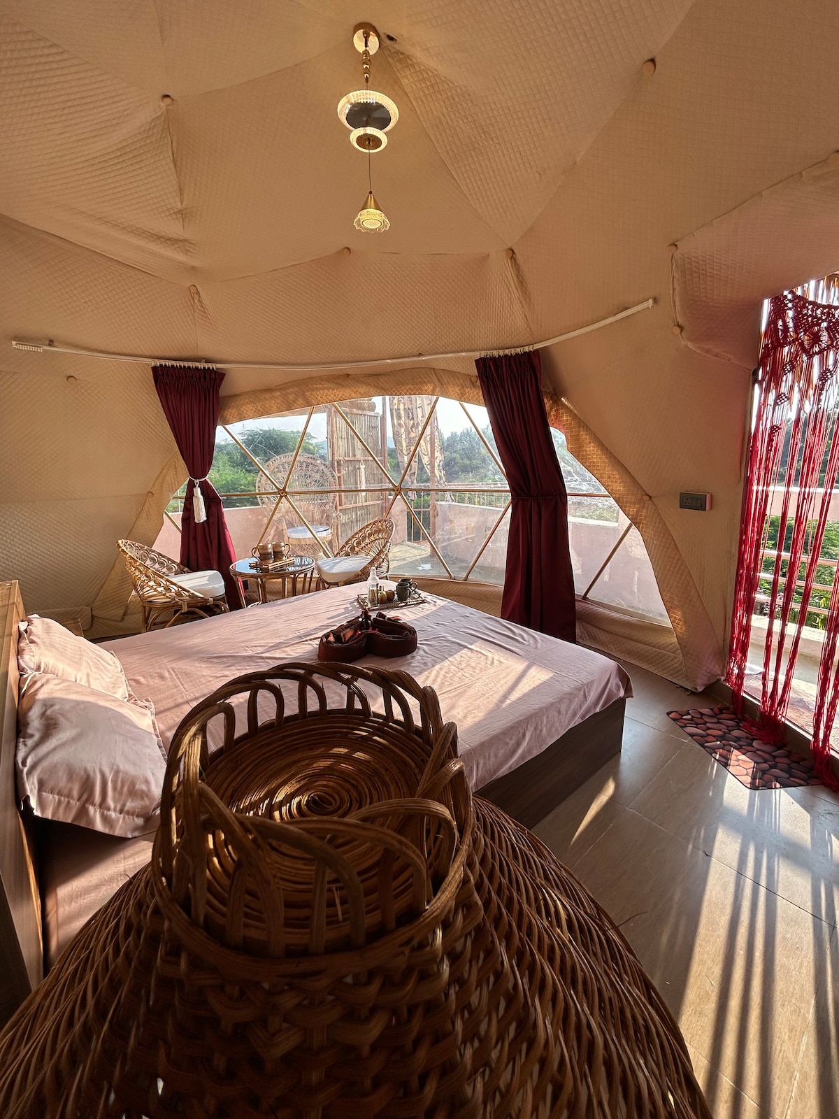 A truly unique touch to your stay is the geodesic dome experience — a stylish, transparent structure designed for stargazing and immersive nature vibes. Inside the dome, you’ll find a luxurious king-size bed, cozy décor, and a peaceful atmosphere that feels both romantic and futuristic. It’s perfect for couples seeking something extraordinary or guests who want a memorable glamping-style stay with hotel-level comfort.