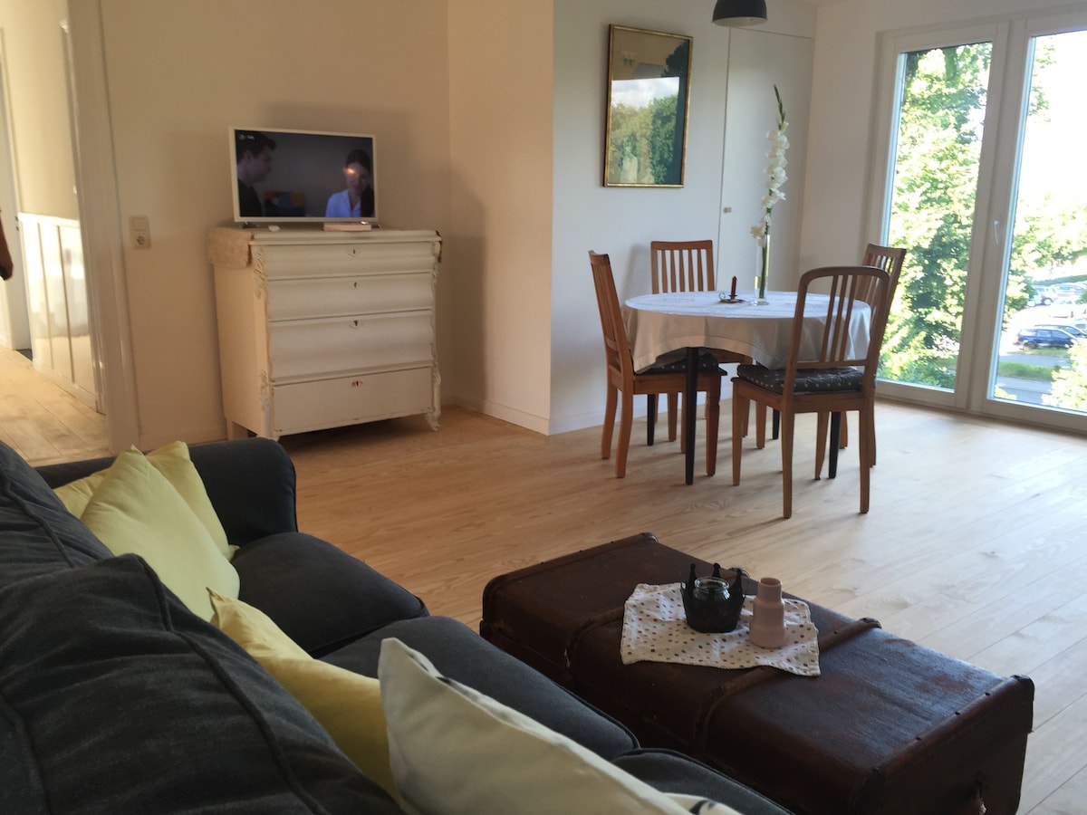Naujas šviesus butas 81 m2, su liftu, balkonu ir garažu su nuosavu automobilio įkrovikliu. Butas tinka apsistoti 3 suaugusiesiems arba 2 suaugusiesiems ir 2 vaikams. Būstas yra be laiptelių ir pritaikytas neįgaliųjų vežimėliams. Labai gera vieta: - 10 min. pėsčiomis nuo Tivolio ir Rotušės aikštės. - 5 min. pėsčiomis iki Metro g. - 50 metrų nuo lauko uosto vonios. - netoliese yra daug gražių kavinių ir parduotuvių (taip pat dviračių nuoma).