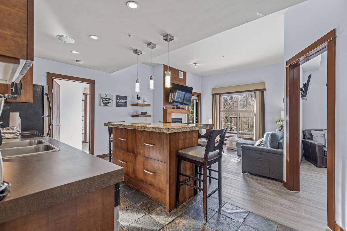 Mėlynasis briedis - naujai atnaujinta ir įrengta erdvi, erdvi vieno miegamojo kondominiumas su karališko dydžio lova ir dvigule sofa-lova. Naujovė 2025 m.: svarbūs vonios kambario ir virtuvės patobulinimai. PUIKI VIETA Ši moderni kalnų poilsio vieta yra šalia tyro kalnų upelio. Eikite į pakrantės gamtos taką ir vos per kelias minutes būsite Kanmoro centre su madingomis parduotuvėmis, kavinėmis, maisto sunkvežimiais ir kasdieniais bei prabangiais pietumis.