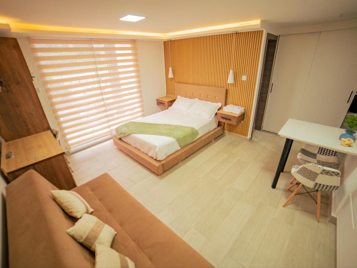 Disfruta de una suite abierta y luminosa con una vista inigualable a la vegetación de Baños. Equipada con una cómoda cama de 2.5 plazas, sofá cama, cocina, comedor, baño privado y una pequeña sala para relajarte. Ideal para parejas, familias pequeñas o viajeros que buscan confort y naturaleza en un solo lugar. ¡Ubicación privilegiada y ambiente acogedor!