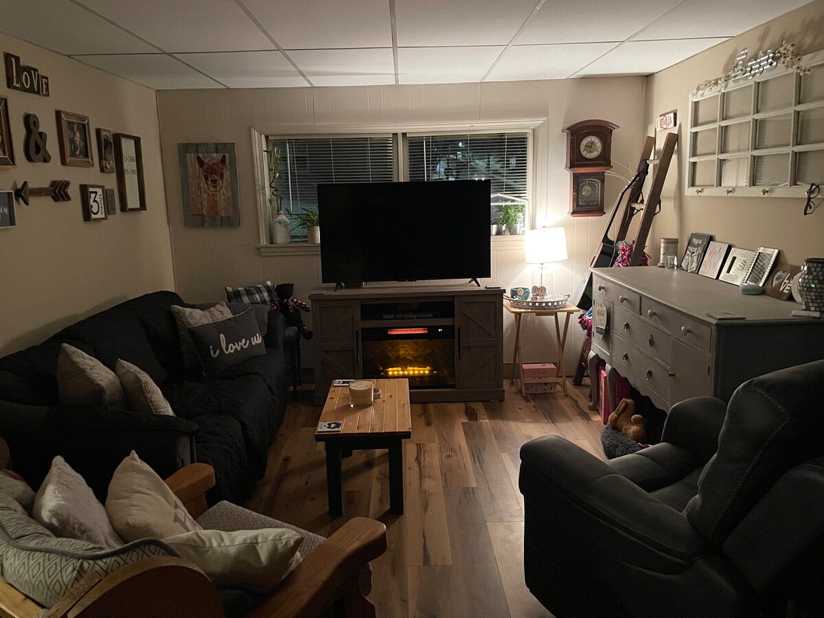 Nice, clean apartment just 5 minutes from Michigan Tech and a view of Portage Lake (lake access too!). One stall of garage parking available so you can go right from car to apartment without dealing with the snow. The driveway is plowed. Wifi, heat, keurig coffee selection included. Washer and dryer are in the spacious bathroom with a shower. Full kitchen and electric fireplace. Stairlift from garage. Queen sized bed with additional pullout couch (about full sz) and toddler bed.