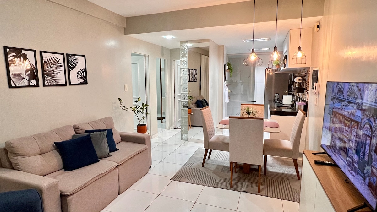 AP 1/4 moderno, aconchegante, em local seguro próximo de supermercado, shopping, bares/restaurantes, pontos turísticos andar alto, com vista, edifício com 2 piscinas, academia, hidro, sauna INCLUSO -Roupa de cama e toalhas - 1 vaga garagem - Cozinha completa - Lava louças - Maquina lava e seca roupas - Smart TV 65" c/ Netflix - Wifi - Alexa (Automação Residencial) - Cafeteiral Oster primalatte - Churrasqueira elétrica -Ar-cond no quarto e sala - Ferro de Passar - Secador