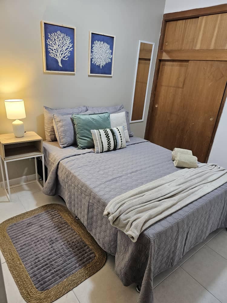 Hermoso apartamento vacacional ideal para familia o amigos. Dispone de Internet fibra óptica 200 megas, habitación principal con cama queen, clóset, baño y Smart TV; segunda habitación con 2 camas individuales y clóset; baño de visitas, cocina equipada, sala con desayunador y aire central. La residencia ofrece piscina, caney, parque infantil, estacionamiento y vigilancia 24/7.