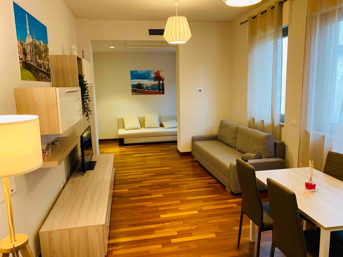 Appartamento accogliente e moderno situato in zona strategica a pochi passi dal centro, dalla stazione centrale dei treni e dei bus. La base ideale per scoprire la Puglia in modo semplice e organizzato. Situato a Bari, l’appartamento permette di raggiungere a piedi centro e stazione e partire ogni giorno alla scoperta delle principali mete della regione. Perfetto per chi vuole esplorare, rilassarsi e tornare in un ambiente curato, tranquillo e confortevole.