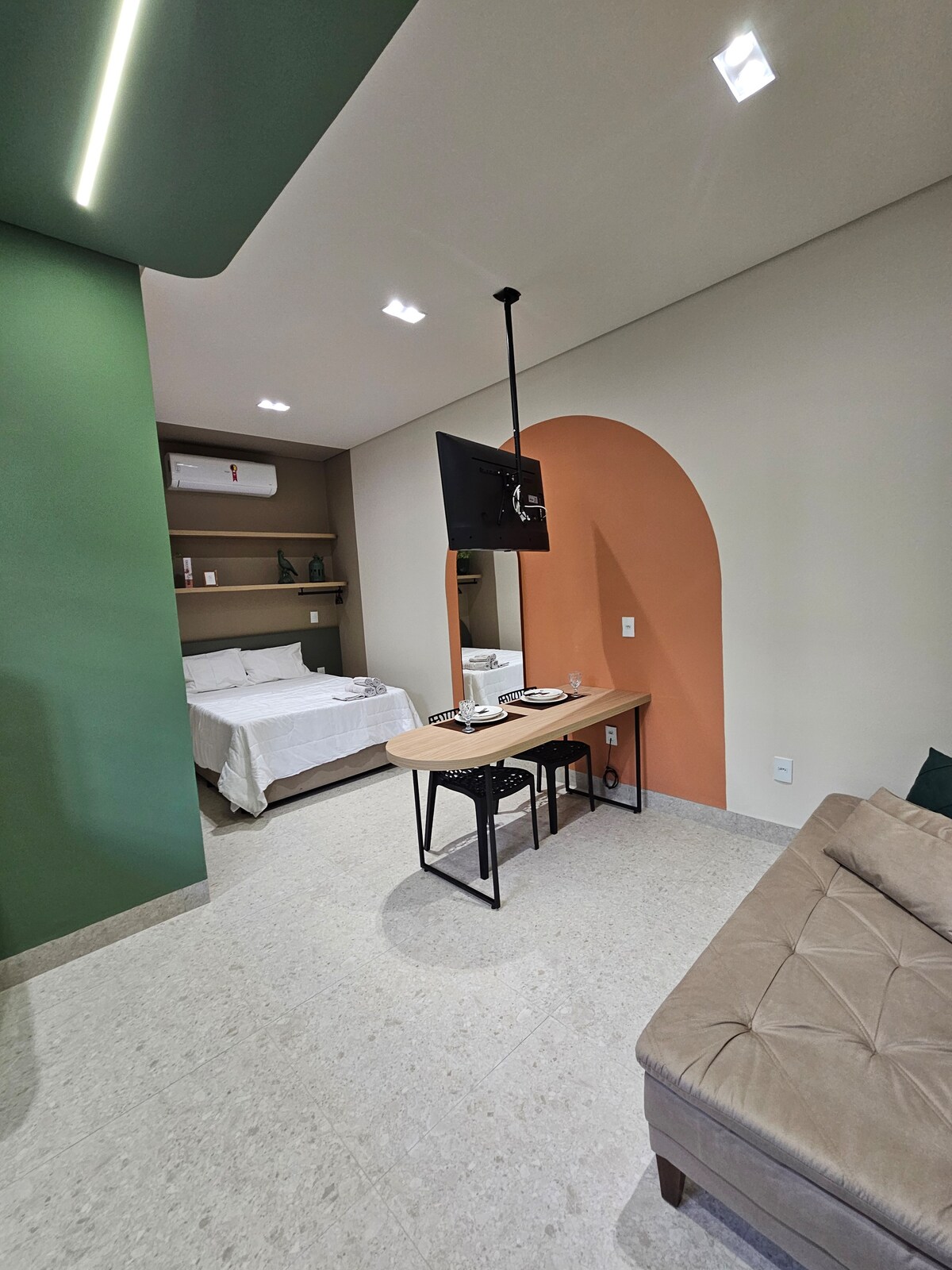 Naujas 32 m² loftas, priešais Amoro ligoninę, šalia Paraíso prekybos centro, netoli kelių parduotuvių pėsčiomis, pvz., turgaus, kepyklos ir vaistinės. Siūlome dengtą stovėjimo vietą ir prieigą prie rampos. • Virtuvė su mini baru, mikrobangų krosnele, kavos aparatu, indais, stalo įrankiais, akiniais ir akiniais. • Kambarys su biuro stalu, internetu ir televizoriumi Smart 32" Globoplay. • Kambarys su 1 dvigule lova, spinta, veidrodžiu ir atskiru vonios kambariu. • Oro kondicionierius, paklodės komplektas ir rankšluosčiai.