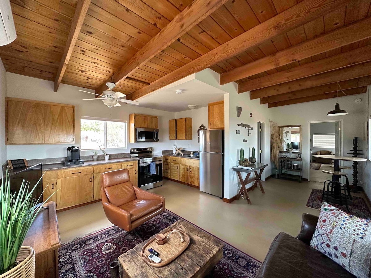 Sveiki atvykę į mūsų gražią 1958 m. sodybą Džonsono slėnyje. „Quailbush“ trobelėje yra 800 kvadratinių pėdų gyvenamosios erdvės. Trobelė, esanti 5 akrų plote, apsupta brandžių pušynų, agavos ir plačiais vaizdais į Mohavių dykumą. Viduje rasite šiltą atmosferą su šiuolaikiniais prisilietimais, pvz., „Roku“ televizoriumi ir „Wi-Fi“. Esame kitoje gatvės pusėje nuo kasmetinio bekelės renginio, Hamerių karaliaus. 30 min. nuo Pioneertown. 40 min. iki Joshua Tree ir Big Bear. Viena valanda iki Palm Springso.
