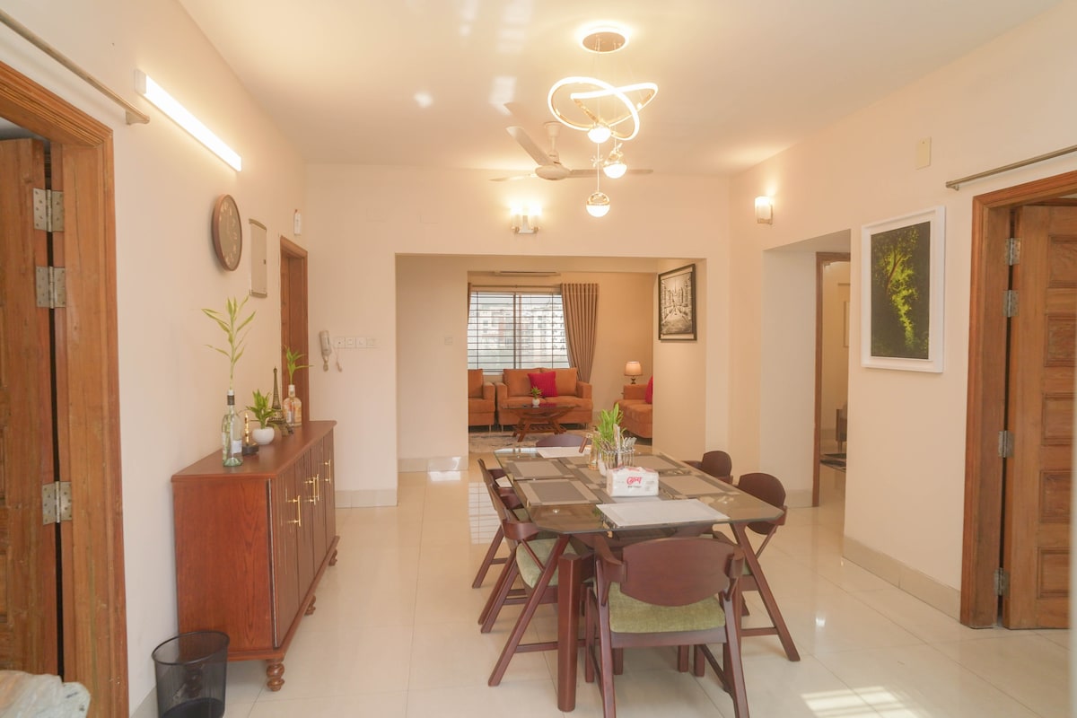 Šis erdvus pilnai įrengtas butas puikiai tinka verslo keliautojams, asmenims, grupėms ir šeimoms. 7-ame aukšte esančiame bute yra 4 balkonai, netrukdomi vaizdai, atviras grindų planas ir modernūs patogumai. 20 min. kelio nuo tarptautinio Dakos oro uosto, Banani yra prabangus, saugus ir daugiausia gyvenamasis rajonas, kuriame yra vietiniai restoranai, parkai ir turgūs. Spartusis BELAIDIS INTERNETAS, biuras, Ant stogo, Sporto salė, Garažas, Įrengta virtuvė, A/C, Virtuvės šefas/ tarnaitė paprašius, Generatorius, Netoliese yra visą parą veikianti kavinė