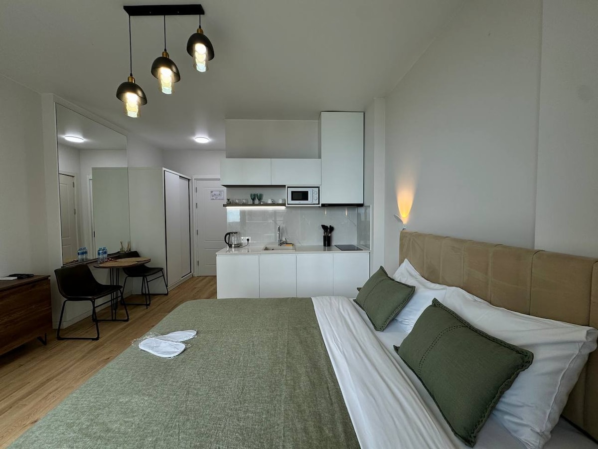 Moderni erdvi aukščiausios klasės studija 17-ame aukšte su nuostabiu vaizdu į jūrą, parką, kalnus ir baseiną. Bute yra viskas, ko reikia patogiai viešnagei: indaplovė, kapsulinis kavos virimo aparatas, skalbimo mašina, skrudintuvas, mikrobangų krosnelė ir kt. Butas yra geriausiame Batumio komplekse su didele teritorija, baseinu, sportu ir žaidimų aikštele kieme, restoranais ir parduotuve. Netoli prekybos centro, kazino, jūros ir parko. Oro uostas yra už 5 minučių kelio automobiliu.