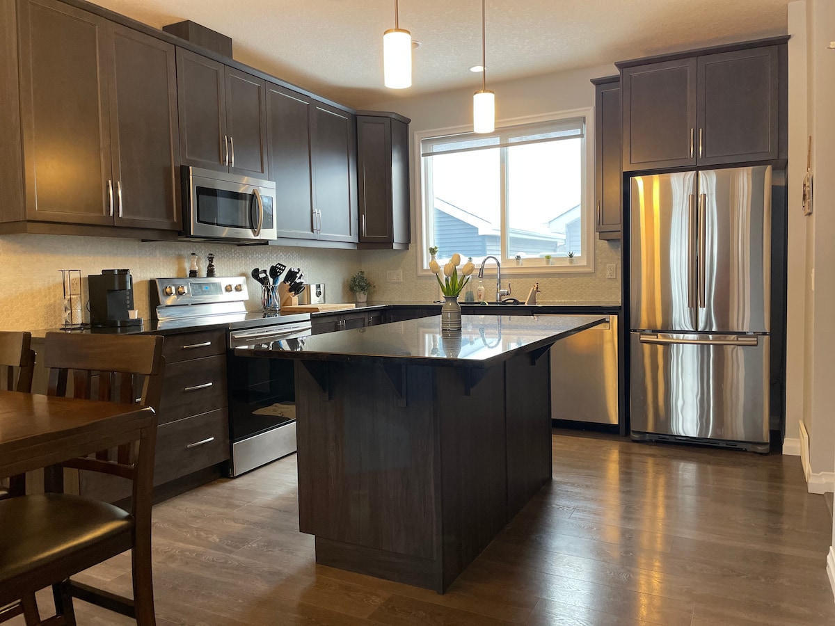 Sveiki atvykę į mūsų namus toli nuo namų! Atsivežkite šeimą arba priimkite kelias šeimas šiuose jaukiuose, erdviuose dviejų aukštų namuose, esančiuose Pietų Edmontono Common-Summerside rajone. Šie namai yra vos už 13 minučių kelio nuo Edmontono tarptautinio oro uosto ir už 5 minučių kelio nuo South Edmonton Common prekybos centro. Namuose yra trys miegamieji, 2 pilnos vonios viršutiniame aukšte, pusė vonios pagrindiniame aukšte ir gerai įrengta virtuvė, puikiai tinkanti maisto ruošimui ir susibūrimams.