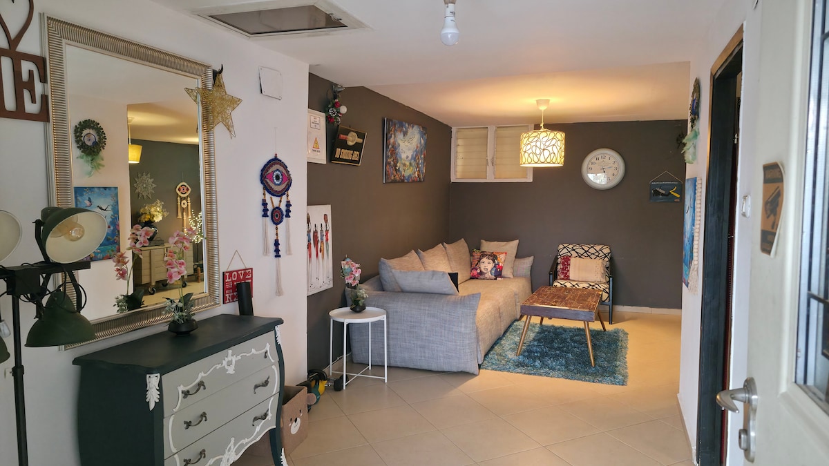 Jaukus ir neįgaliesiems pritaikytas jaukus butas pirmame aukšte su atskiru įėjimu į butą. Įsikūręs Be 'er Sheva centre, A rajone, kuriame yra daug nemokamos automobilių stovėjimo aikštelės, mieli kaimynai ramioje ir ramioje vietoje. Pėsčiomis pasieksite senamiestį, Negev prekybos centrą, lokomotyvų kompleksą, Didįjį kanjoną, turgų ir centrinę stotį. Daugelis pramogų vietų yra už 5 minučių kelio pėsčiomis iki senamiesčio. Bute yra lauko svetainės zona su stalu ir kėdėmis, miegamasis su didele spinta ir plačia patogia lova bei televizoriumi, virtuvėje - šaldytuvas ir mikrobangų krosnelė, svetainėje - lubinė ventiliatoriaus sofa ir patogi sofa, dušo veidas ir kūno rankšluosčiai, rankų muilas. Dėl skalbimo mašinos galima iš anksto susitarti su namo savininku.
