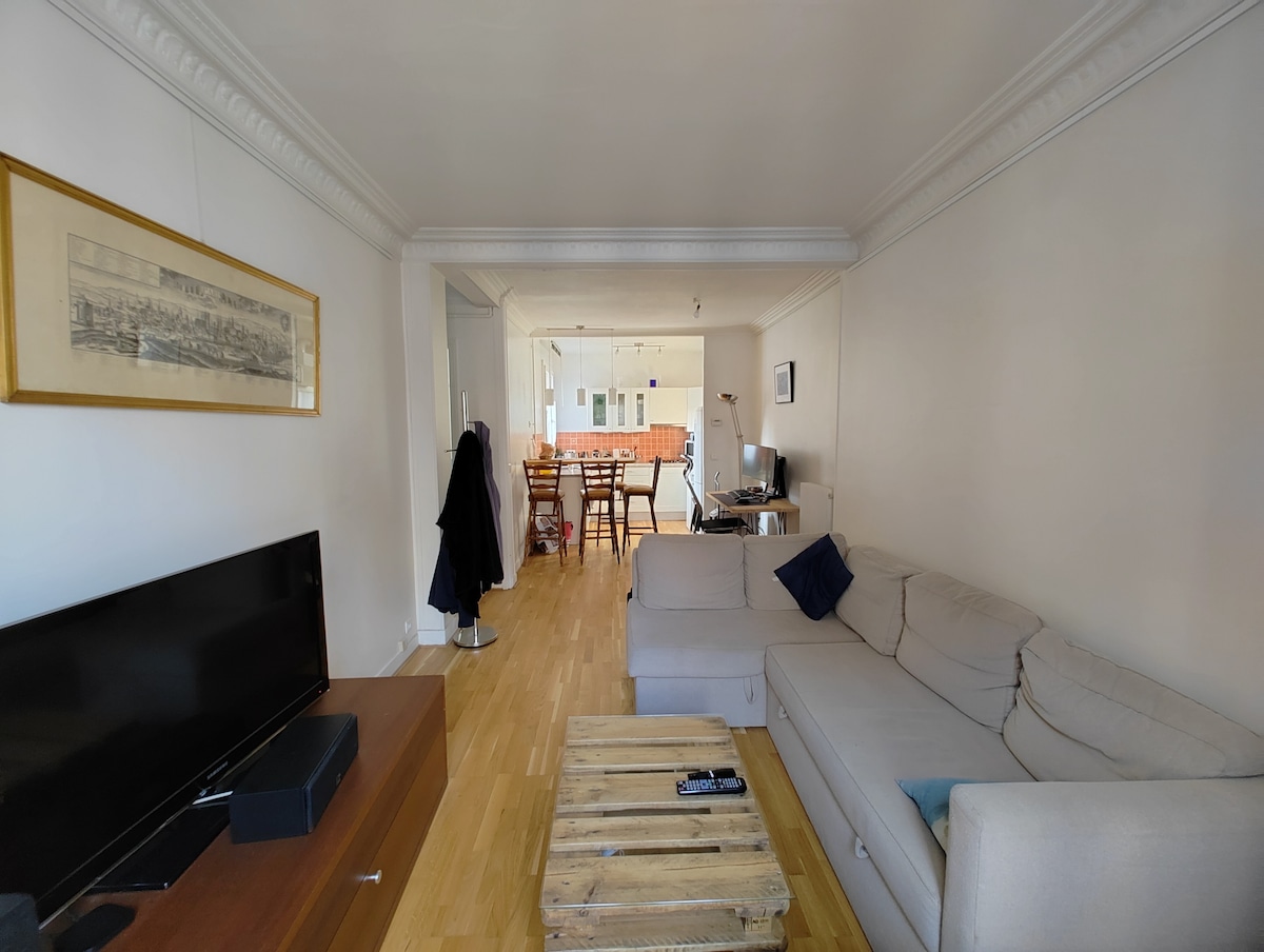 Gražus šiuolaikiškas butas, visiškai renovuotas, šviesus, gerai įrengtas, su didele svetaine, atvira virtuve, vienu miegamuoju, WC ir atskiru vonios kambariu. Ramioje gatvėje butas yra netoli metro (Place des Fêtes - linija 11) ir netoli Jourdain parduotuvių, Rue de la Villette barų / restoranų ir Buttes Chaumont parko. Bute nerūkoma ir vakarėliai draudžiami.
